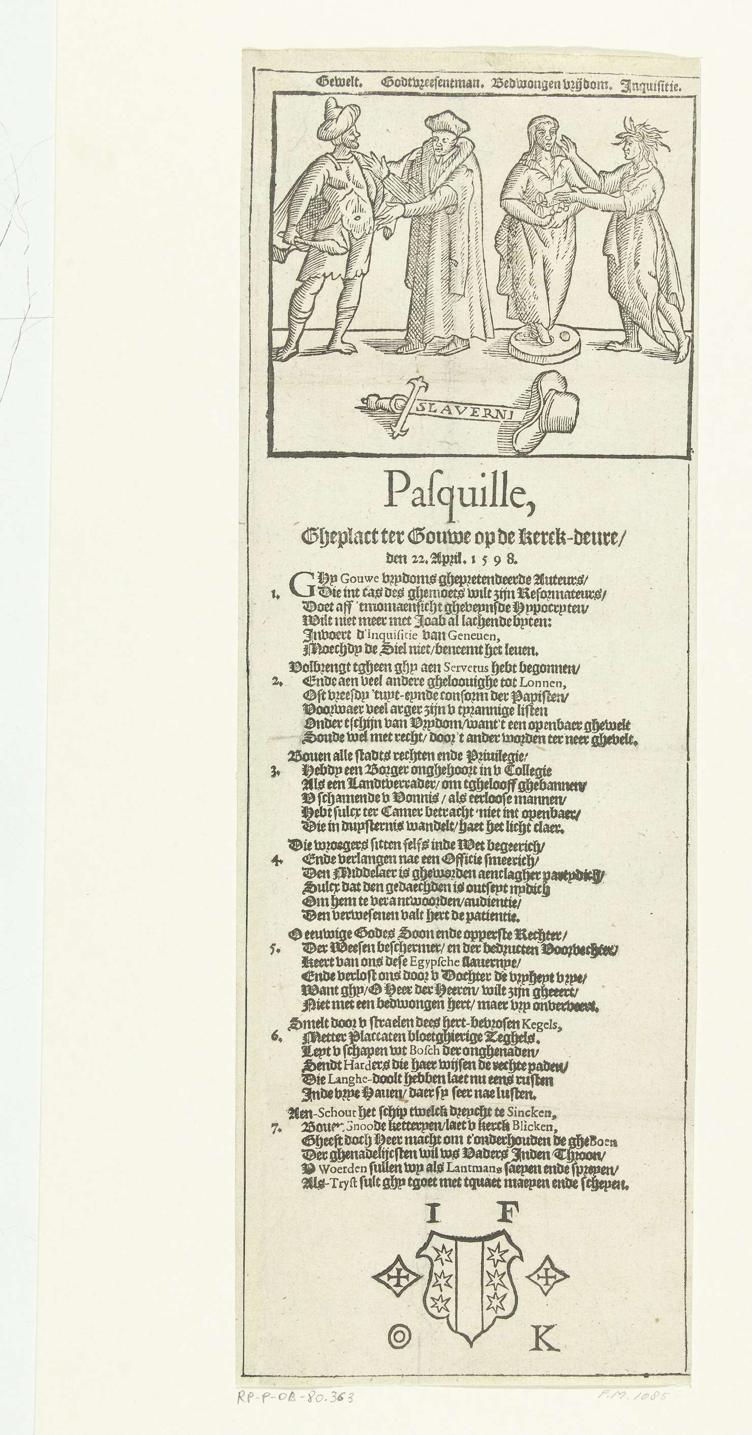 Roomsgezind paskwil te Gouda op de kerkdeur geplakt, 22 april 1598. Anti-Calvinistische allegorische voorstelling waarin Godtvreesentman wordt aangevallen door Gewelt en Bedwongen vrijdom door de Inquisitie van Genève. Op de grond een zwaard met de vrijheidshoed aangeduid als Slavernij. Met onderschrift van 7 verzen van elk 6 regels in het Nederlands. Onderaan het wapen van ...