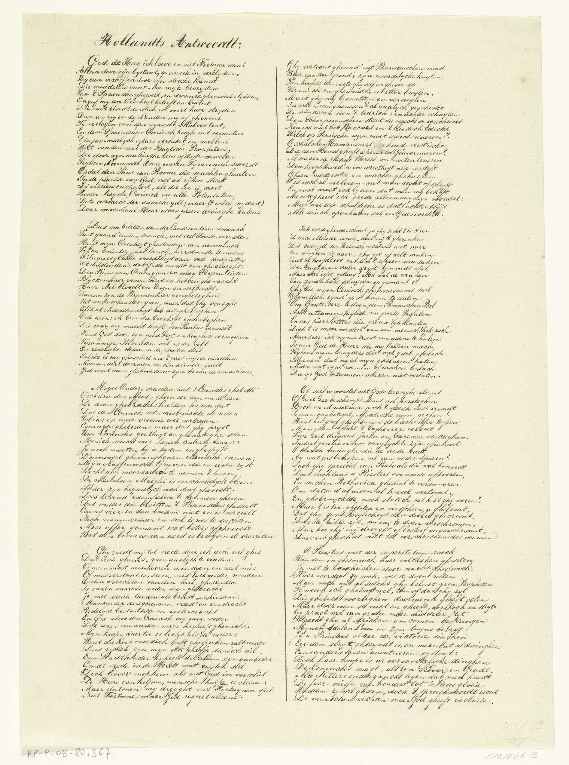 Transcriptie van de verzen bij een anti-Spaanse politieke allegorie uit 1598. Handschrift van acht verzen in twee kolommen in het Nederlands.