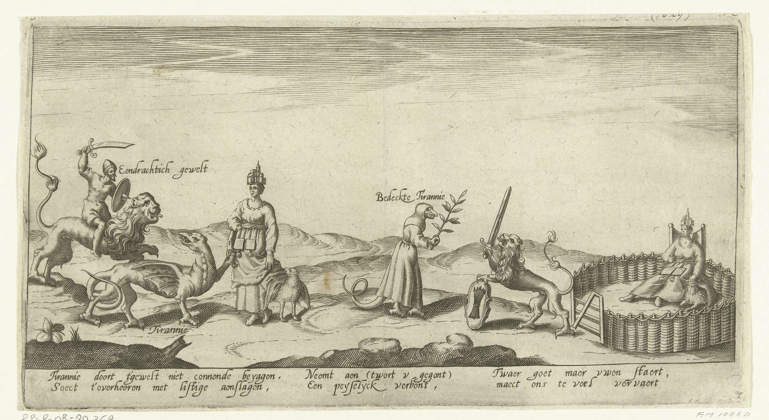 Allegorie op de bedrieglijke vredesvoorstellen gedaan door Spanje in april 1598. De Nederlandse Maagd wordt door Eendrachtig Geweld, een soldaat rijdend op de Hollandse Leeuw, beschermd tegen de aanvallen van de draak Tirannie. Bedekte Tirannie met vredesvoorstellen, een duivel in monnikspij met een olijftak, wordt bij de poort van de Hollandse Tuin tegengehouden door de ...