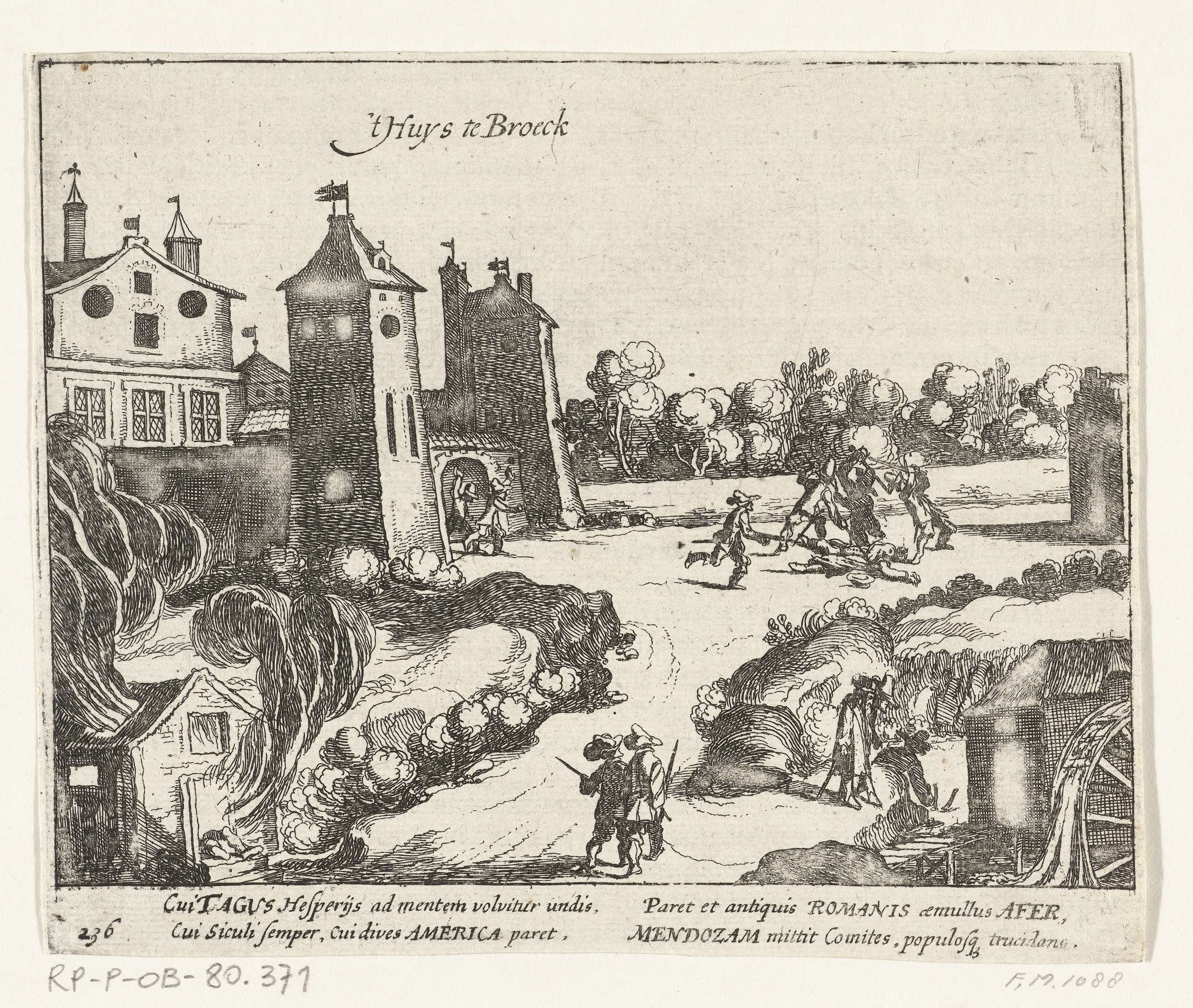 Verovering van het kasteel te Broek aan de Ruhr en de moord op Wirich von Daun, graaf van Falkenstein, door de Spanjaarden onder Francisco de Mendoza begaan op 11 oktober 1598. Met onderschrift van vier regels in het Latijn. Genummerd 236. Bedrukt op de achterzijde met tekst in het Latijn.