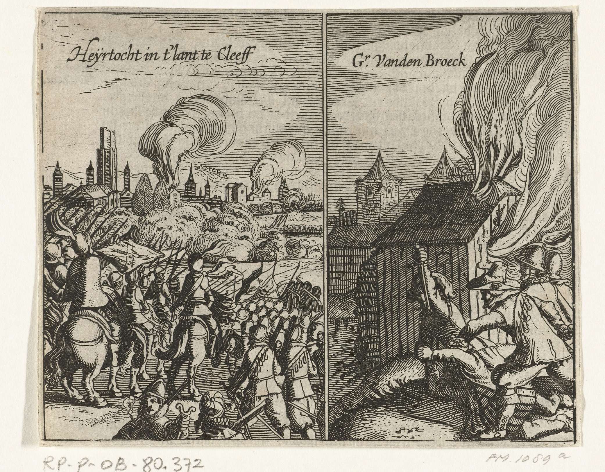 Twee voorstellingen van de plundertocht van de Spanjaarden in het land van Kleef en de verovering van het kasteel te Broek aan de Ruhr en de moord op Wirich von Daun, graaf van Falkenstein, door de Spanjaarden onder Francisco de Mendoza begaan op 11 oktober 1598. Bedrukt op de achterzijde met tekst in het Nederlands.