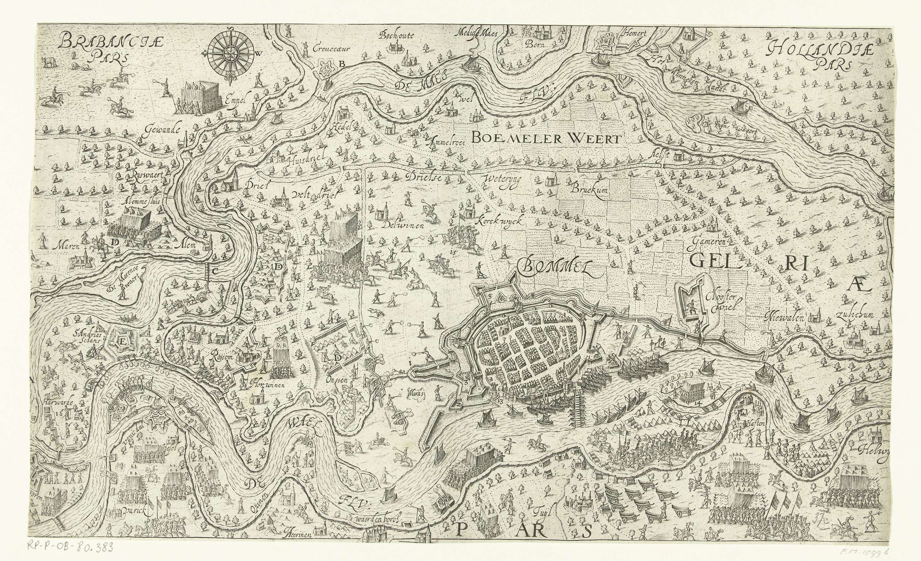 Belegering door de Spanjaarden onder Mendoza van Zaltbommel en andere sterkten in de Bommelerwaard in handen van het Staatse leger onder prins Maurits, en de bouw van de schans Sint-Andries, begin mei tot september 1599. Links de Maas, onderaan de Waal, in het midden Bommel. Zonder de legenda onder de plaat.
