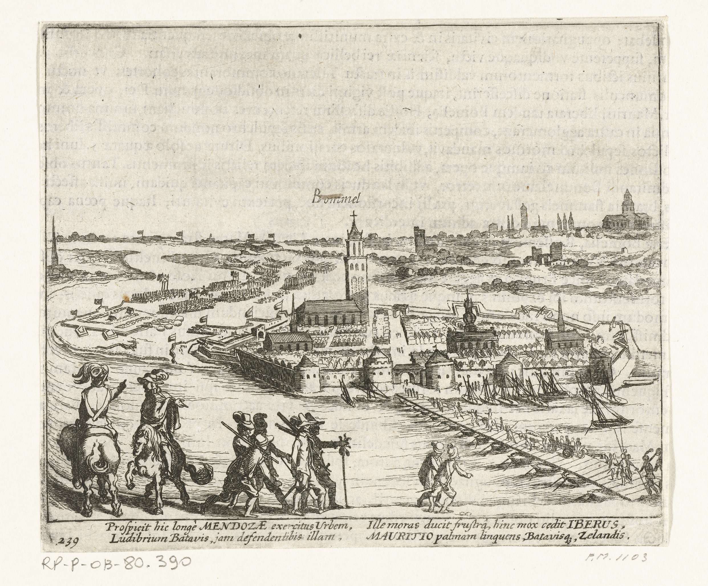 De belegering van de stad Zaltbommel door het Spaanse leger onder Mendoza en verdedigd door het Staatse leger onder Maurits, mei-juni 1599. Gezicht op de stad vanaf de overkant van de Waal, op de voorgrond enkele officieren te paard en een schipbrug over de rivier. Met onderschrift van 4 regels in het Latijn. Genummerd 239. ...