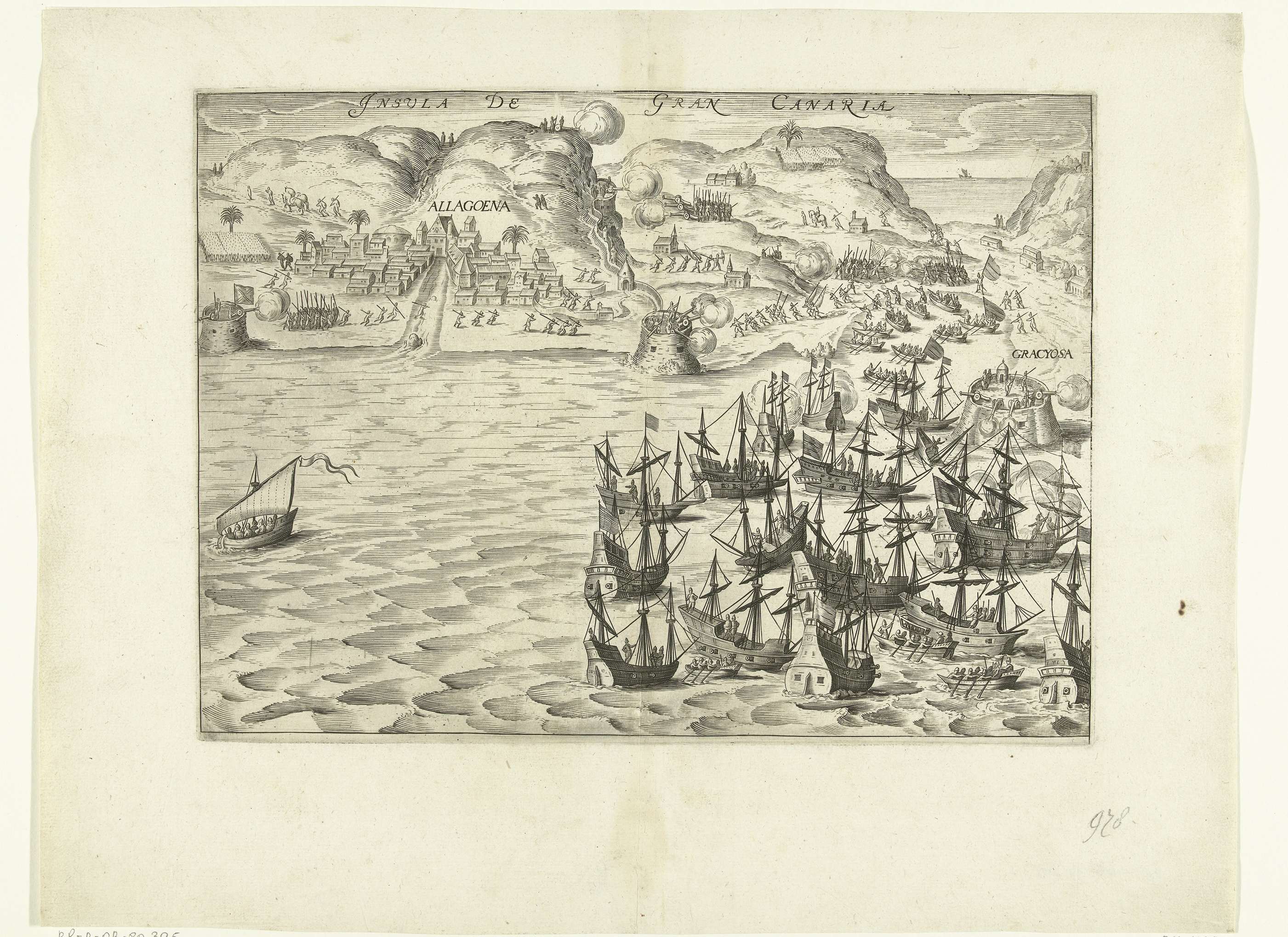 Verovering van het eiland Gran Canaria en de stad Allagona door de Staatse vloot onder admiraal Pieter van der Does, 26 juni 1599. Op de voorgrond de Nederlandse vloot, vanaf forten aan de kust beschieten de Spanjaarden de Hollandse schepen. Rechts de vesting Graciosa.