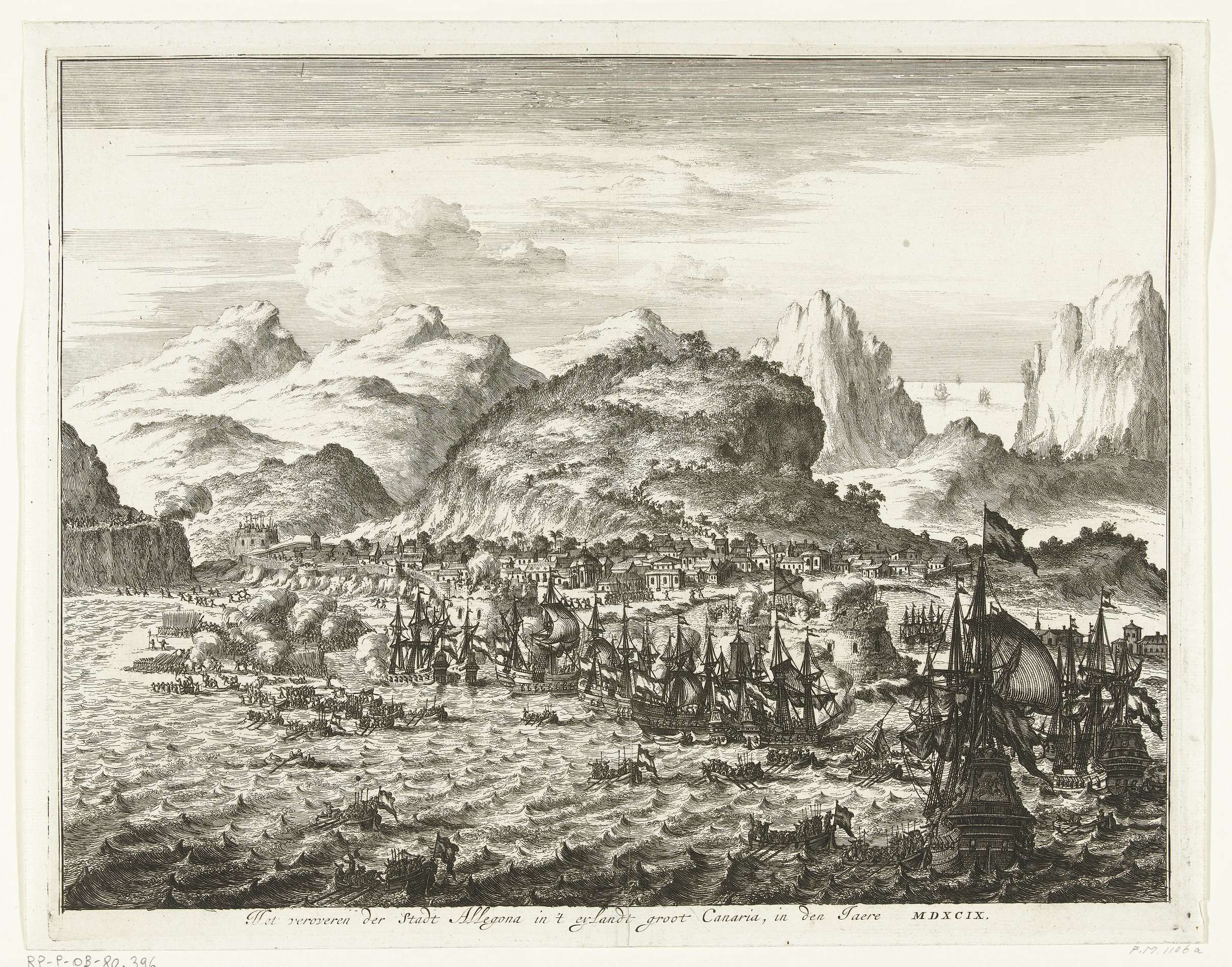 Verovering van het eiland Gran Canaria en de stad Allagona door de Staatse vloot onder admiraal Pieter van der Does, 26 juni 1599. Op de voorgrond de Nederlandse vloot, vanaf forten aan de kust beschieten de Spanjaarden de Hollandse schepen.