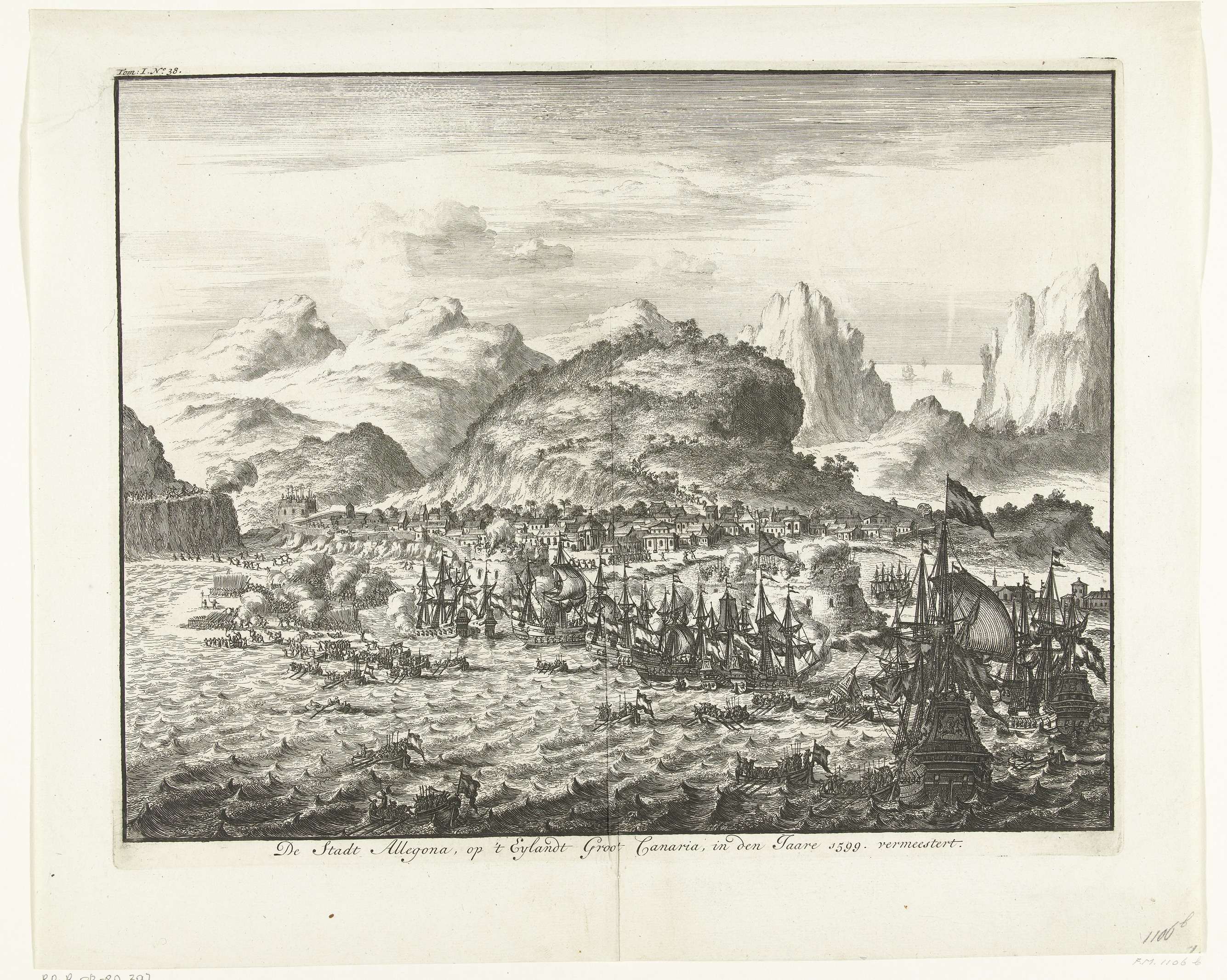 Verovering van het eiland Gran Canaria en de stad Allagona door de Staatse vloot onder admiraal Pieter van der Does, 26 juni 1599. Op de voorgrond de Nederlandse vloot, vanaf forten aan de kust beschieten de Spanjaarden de Hollandse schepen.
