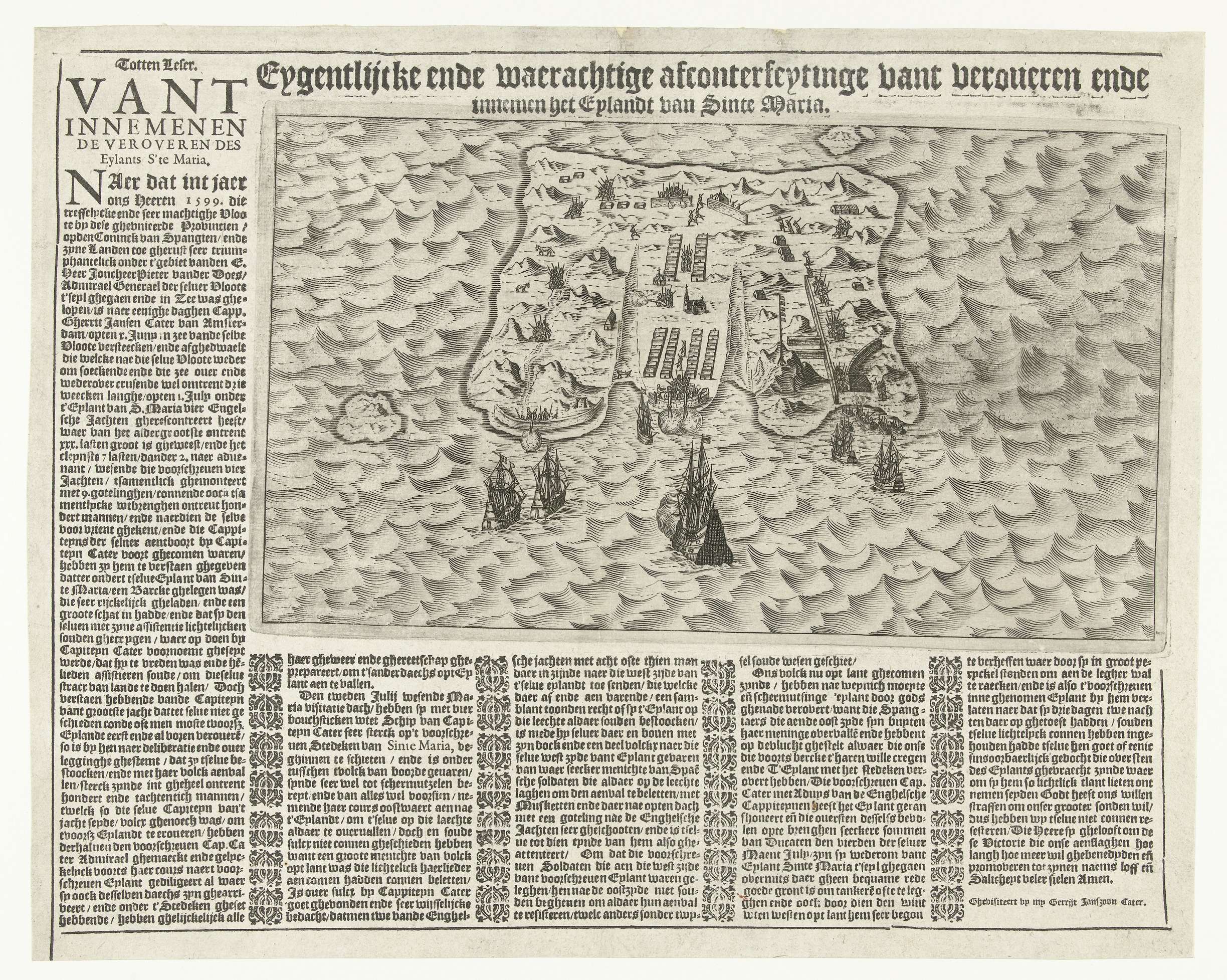 Verovering van het eiland Santa Maria in de Azoren door kapitien Gerrit Jansen Cater, 2 juli 1599. Het schip van Cater samen met vier kleine Engelse schepen voor het eiland. Om de voorstelling een beschrijving van de gebeurtenissen in 5 kolommen in het Nederlands.