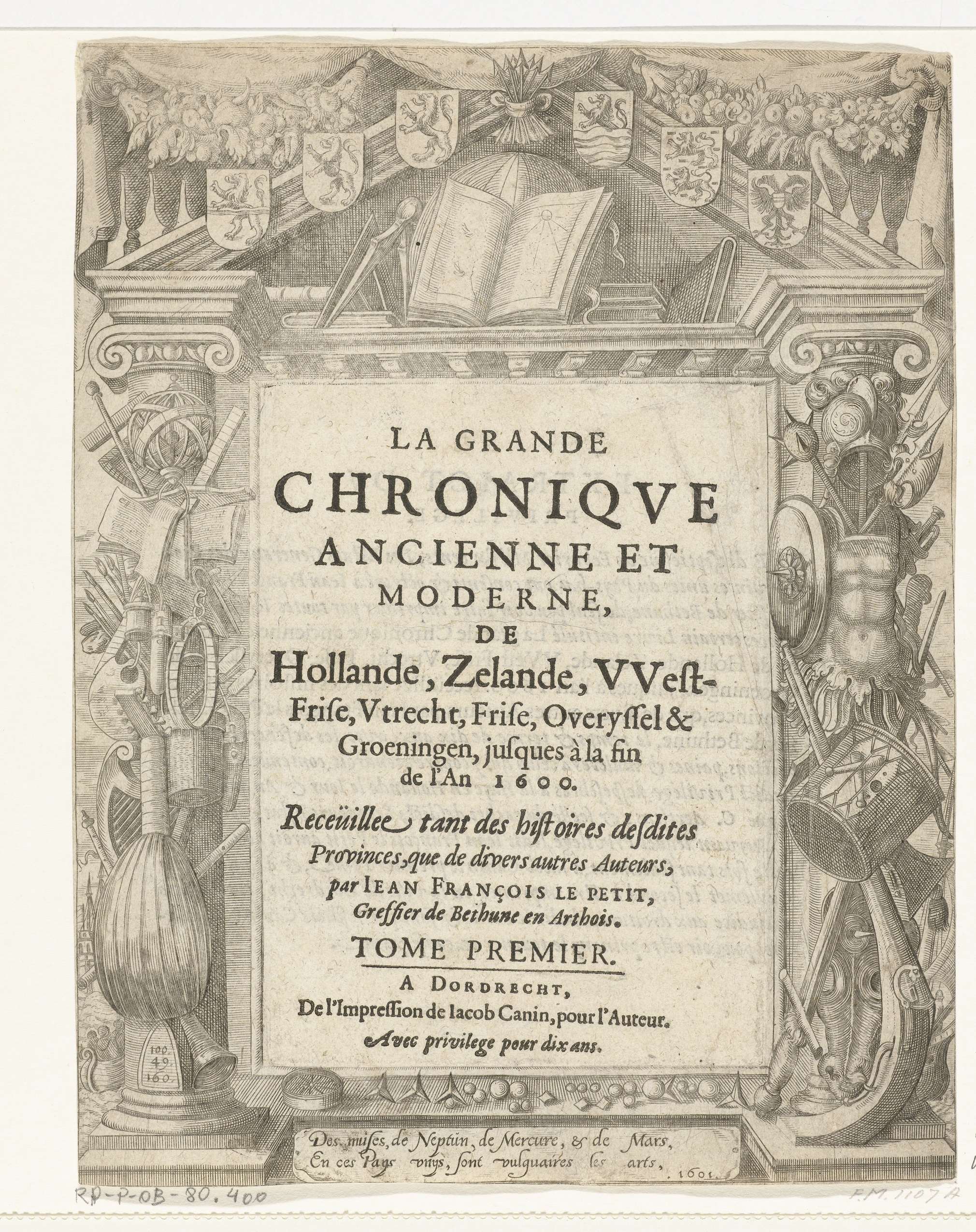 Titelblad van J.F. Le Petit, La grande chronique ancienne et moderne, de Hollande, Zelande, West-Frise, Utrecht, Frise, Overijssel et Groeningen, jusques à la fin de l'an 1600, Dordrecht 1601. In het midden de gedrukte titel, in architecturale omlijsting van muziekinstrumenten, wetenschappelijke instrumenten, attributen van de schilderkunst, boeken, provinciewapens, festoenen, wapens en wapenrusting. Bedrukt op achterzijde ...