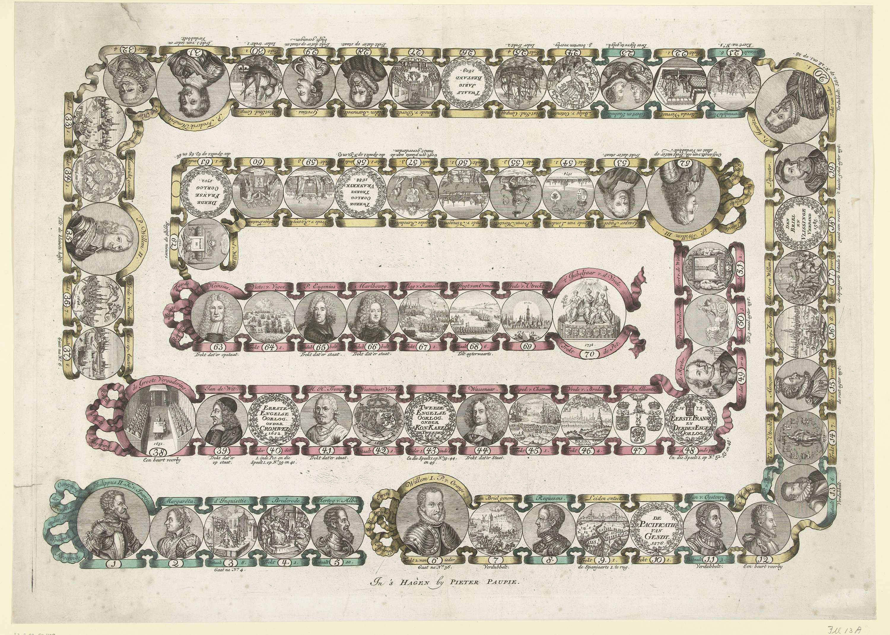 Bordspel waarin gespeeld wordt op een bord met vakken voor belangrijke personen en gebeurtenissen uit de geschiedenis van Nederland. Met vakken genummerd van nr. 1 ( Filips II) tot en met nr. 71 met het jaar 1738, het Jubeljaar van de vrede.
