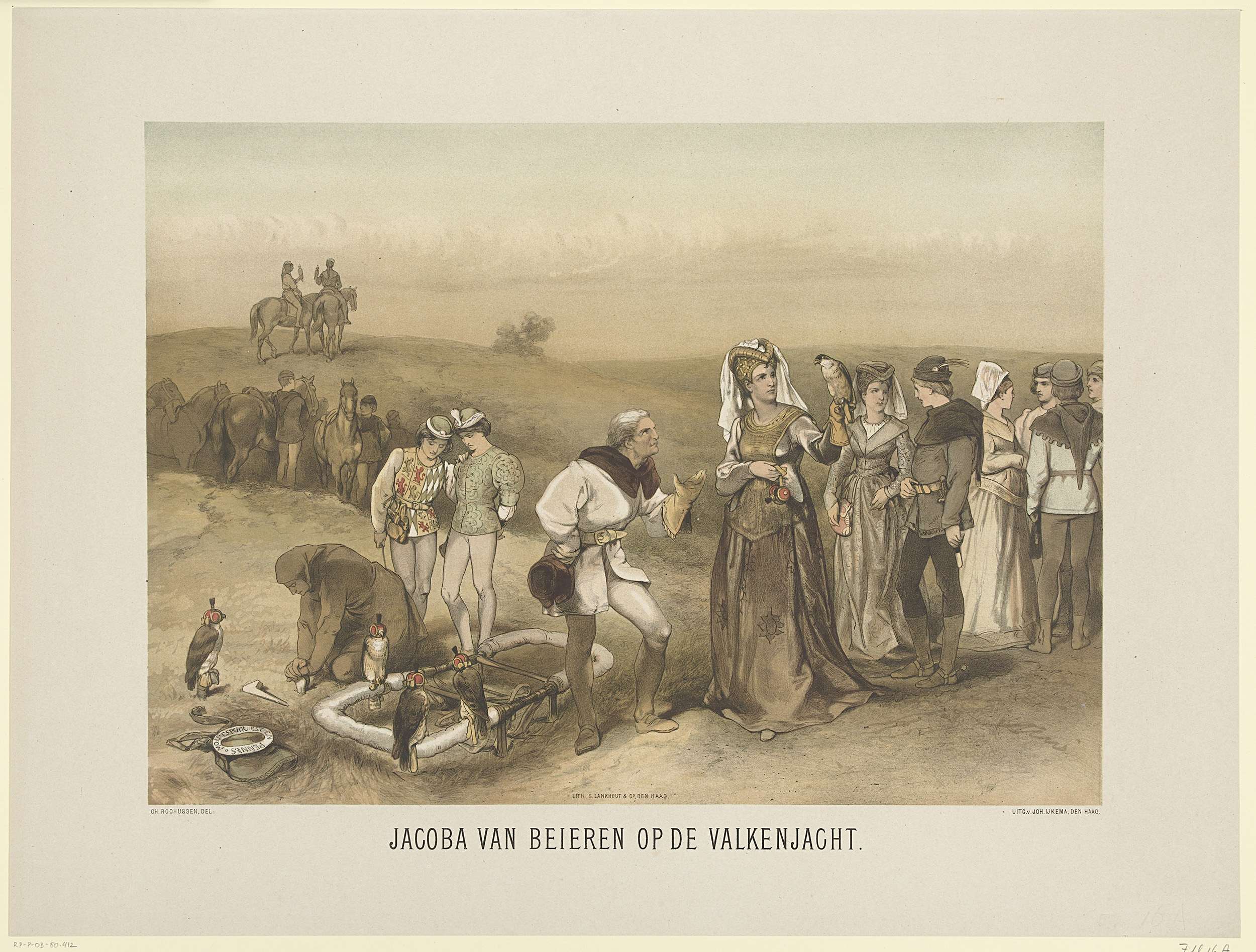 Jacoba van Beieren, gravin van Holland, Zeeland en Henegouwen, met gevolg van edelen op valkenjacht, ca. 1420.