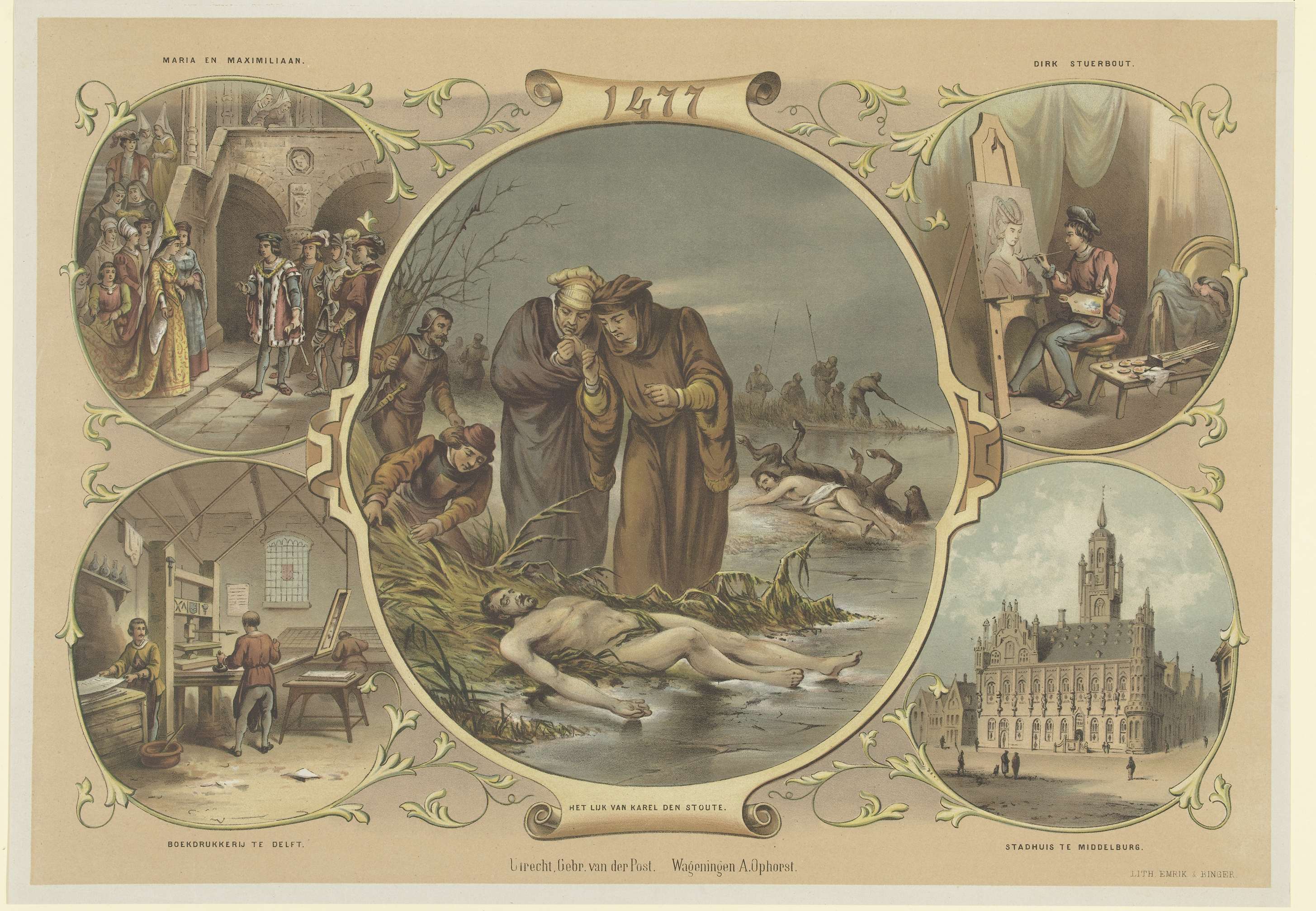 Gebeurtenissen in en rond het jaar 1477. In het midden de vondst van het lijk van Karel de Stoute vastgevroren in de modder bij Nancy. Hieromheen vier kleinere scènes van contemporaine gebeurtenissen: een boekdrukkerij te Delft, het huwelijk van Maximiliaan I met Maria van Bourgondië, de schilder Dieric Bouts (Dirk Stuerbout) en het Stadhuis van ...