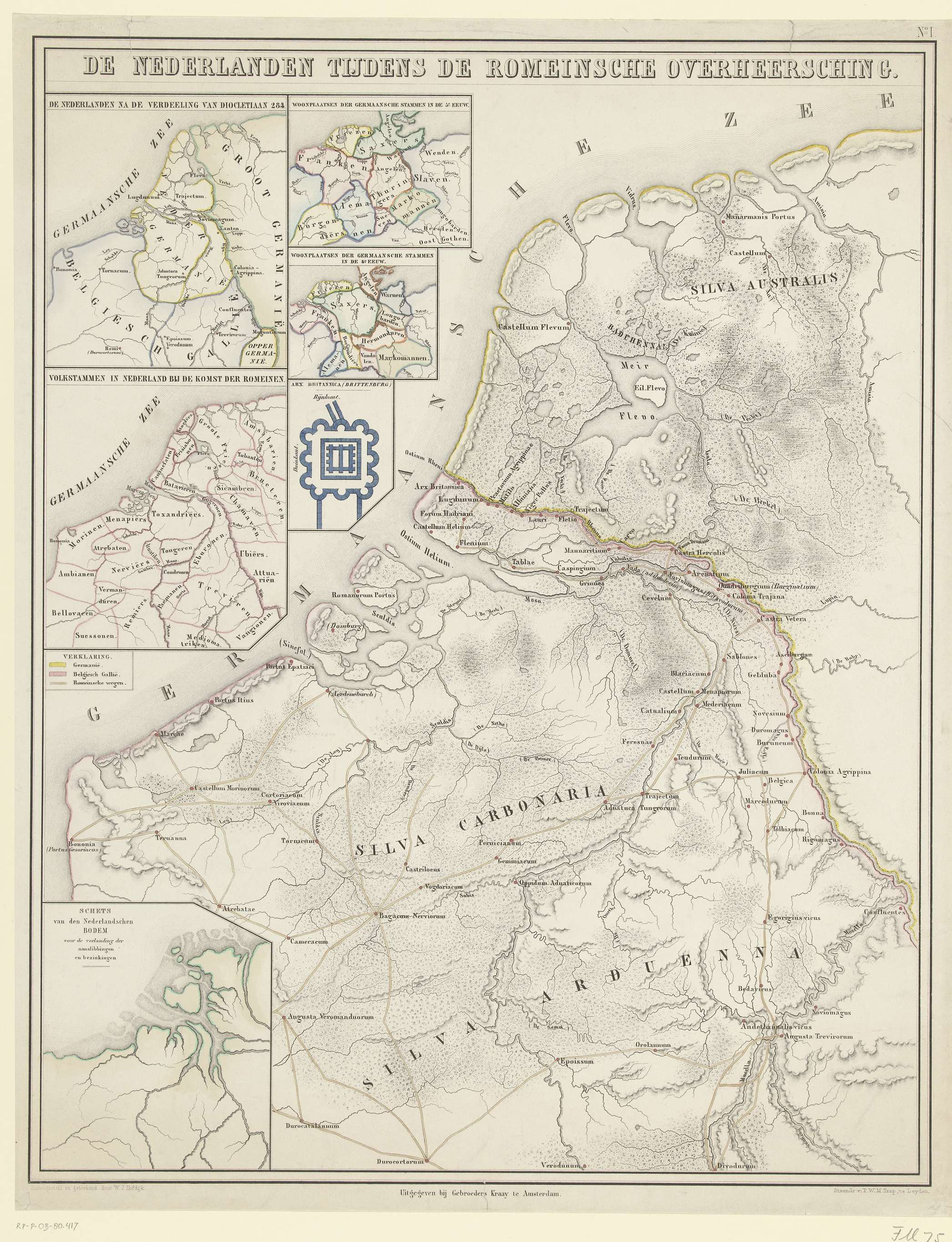 Kaart van de Nederlanden in de Romeinse tijd. Met verschillende inzetten met deelkaartjes en een plattegrond van Brittenburg. Met de belangrijkste Romeinse wegen en de grens tussen Germanië en Belgisch Gallië. Genummerd rechtsboven: No. I.
