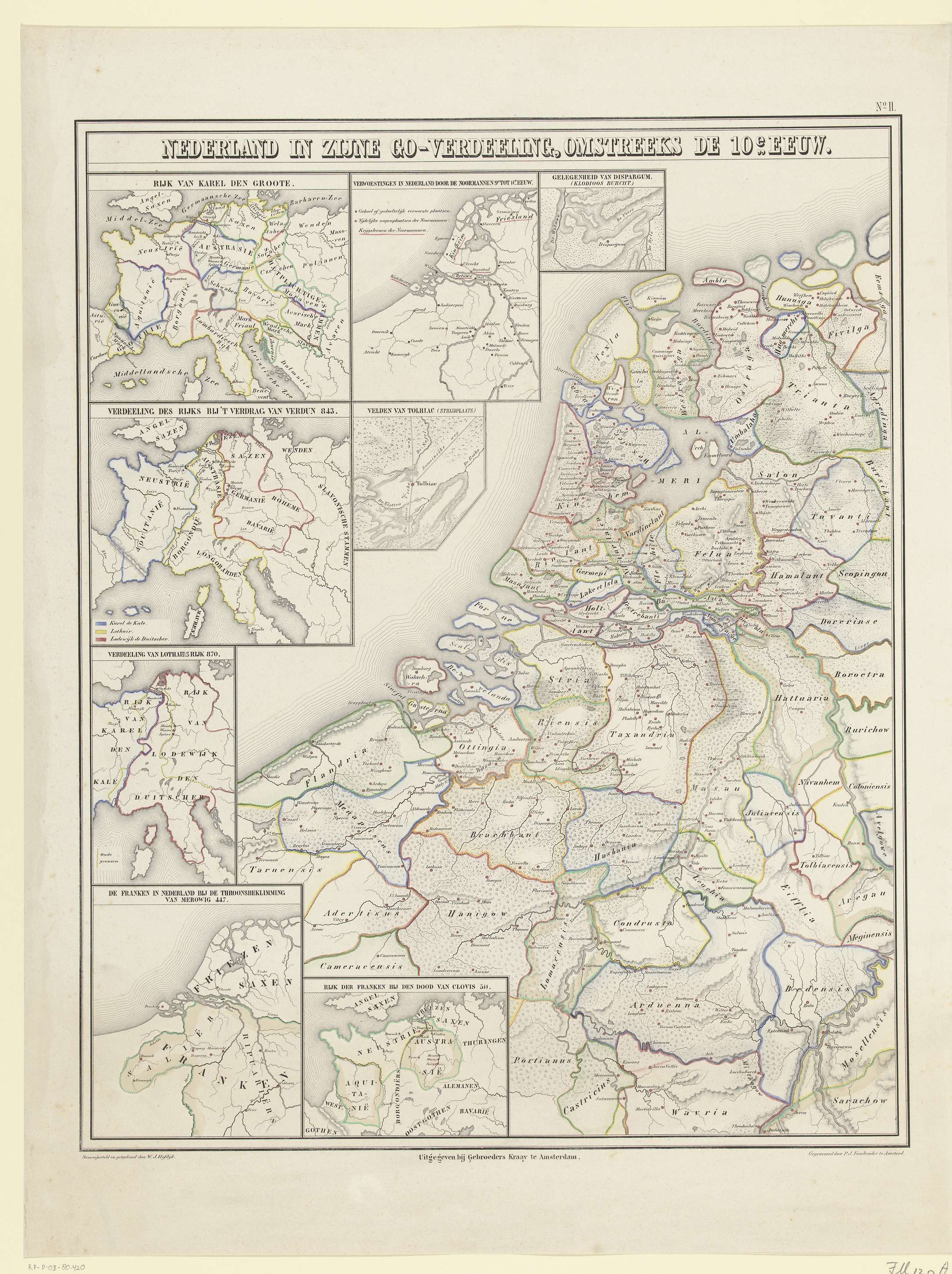 Kaart van de Nederlanden omstreeks de tiende eeuw. Met verschillende inzetten met acht deelkaartjes van Nederland en Europa. De grenzen tussen de verschillende gewesten (de "go") met kleuren aangegeven. Genummerd rechtsboven: No. II.