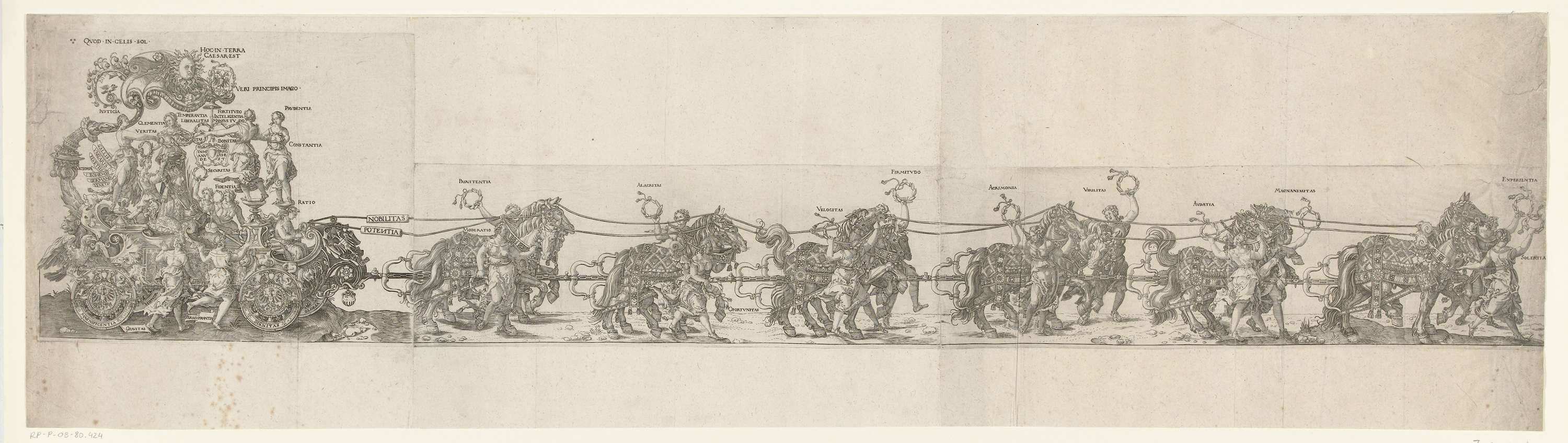 De grote triomfwagen. Triomfwagen ter ere van keizer Maximiliaan I bij zijn overlijden op 12 januari 1519. Wagen met de keizer getrokken door zes spannen van twee paarden. De wagen en de paarden begeleid door vrouwelijke personificaties van allerlei deugden.