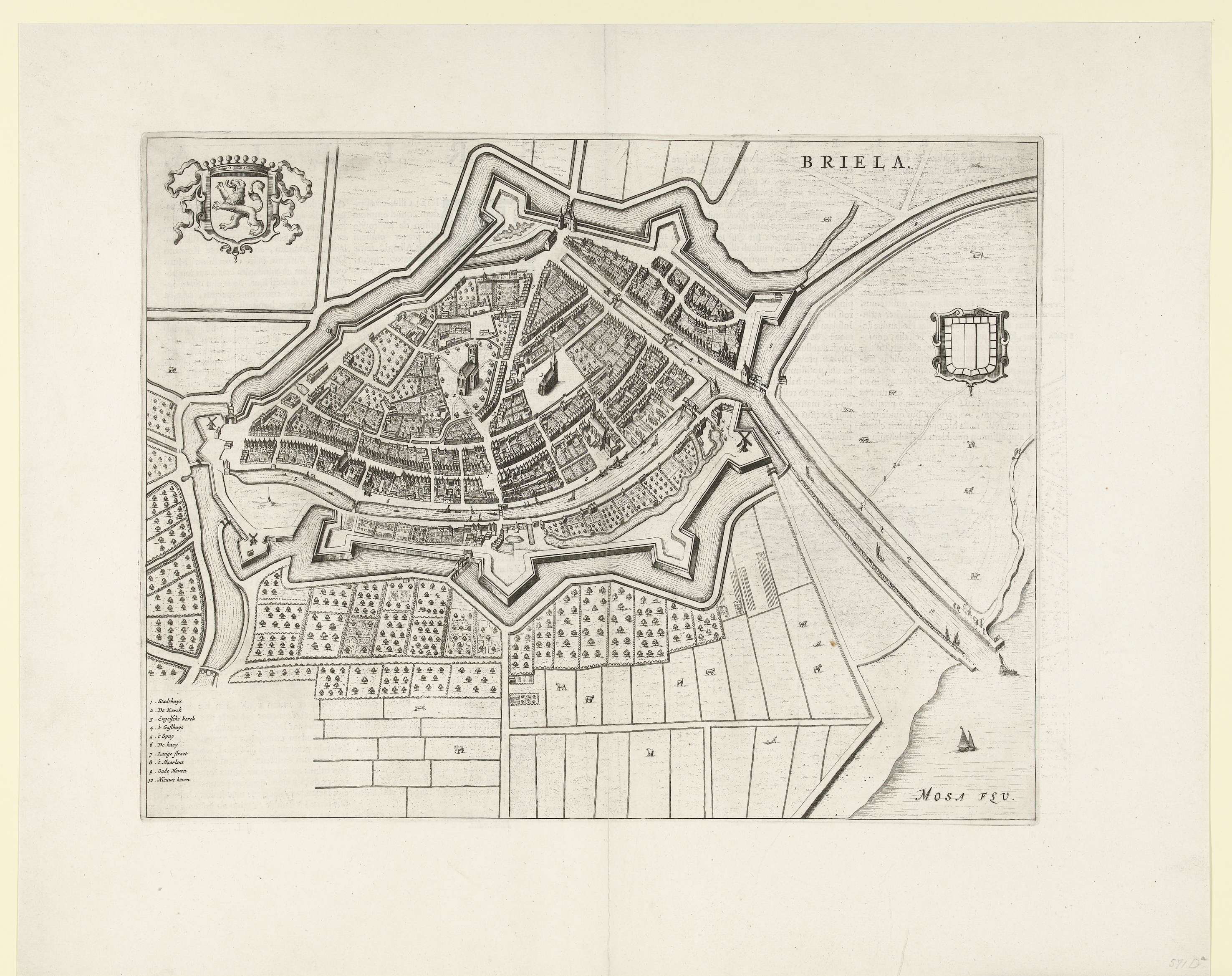 Plattegrond van Den Briel en een deel van het omringend land. Linksboven het wapen van de stad, linksonder de legenda 1-10 in het Nederlands. Op een dubbelblad uit het Stedenboek van Blaeu genomen, op beide zijden bedrukt met tekst in het Latijn.