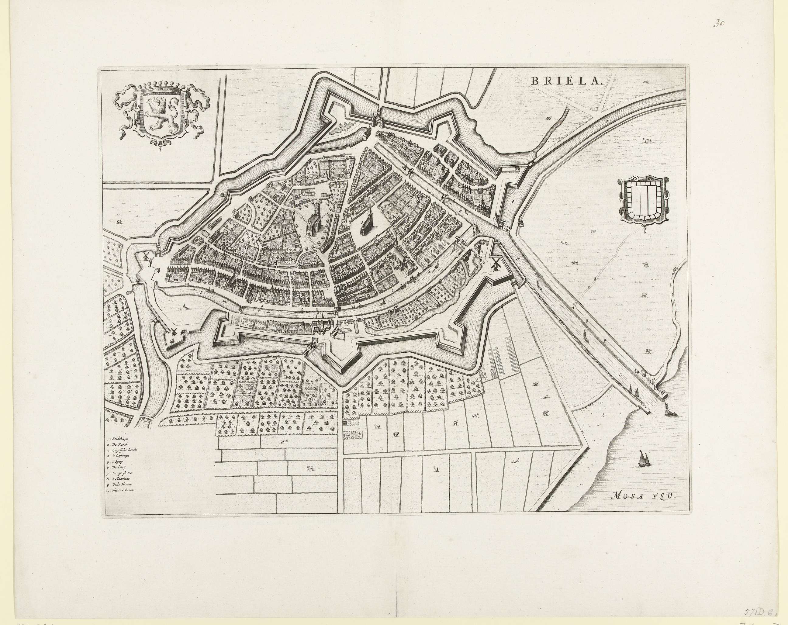 Plattegrond van Den Briel en een deel van het omringend land. Linksboven het wapen van de stad, linksonder de legenda 1-10 in het Nederlands. Op een dubbelblad uit het het Stedenboek van Blaeu genomen, op beide zijden bedrukt met tekst in het Nederlands.