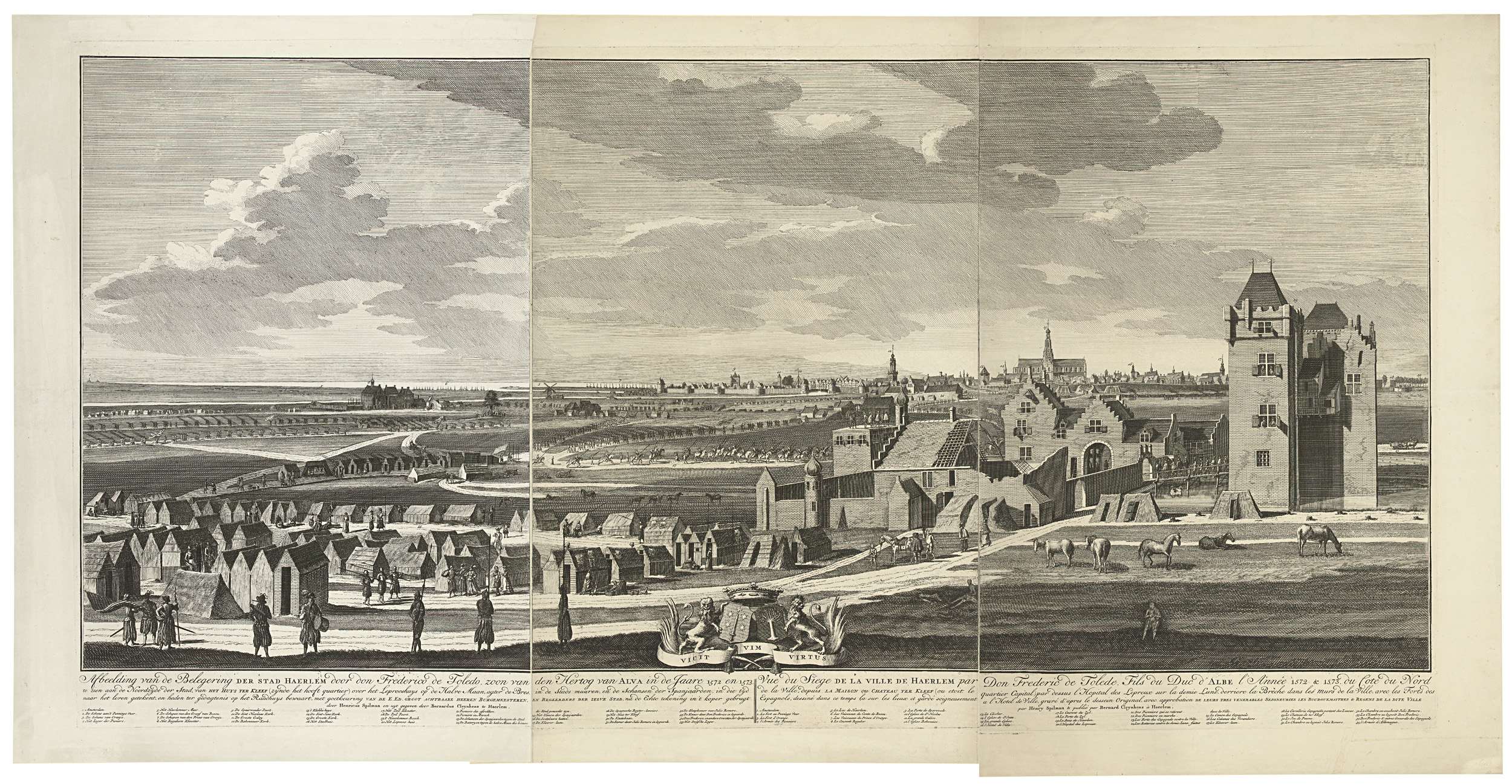 Belegering van de stad Haarlem in de jaren 1572-1573 door de Spanjaarden onder Fadrique Alvarez de Toledo (Don Frederik), de zoon van de hertog van Alva. Grote voorstelling met een gezicht op de stad vanuit het noorden, in prent naar een eigentijdse tekening in drie bladen. Onder in het midden het wapen van Haarlem. Rechts ...