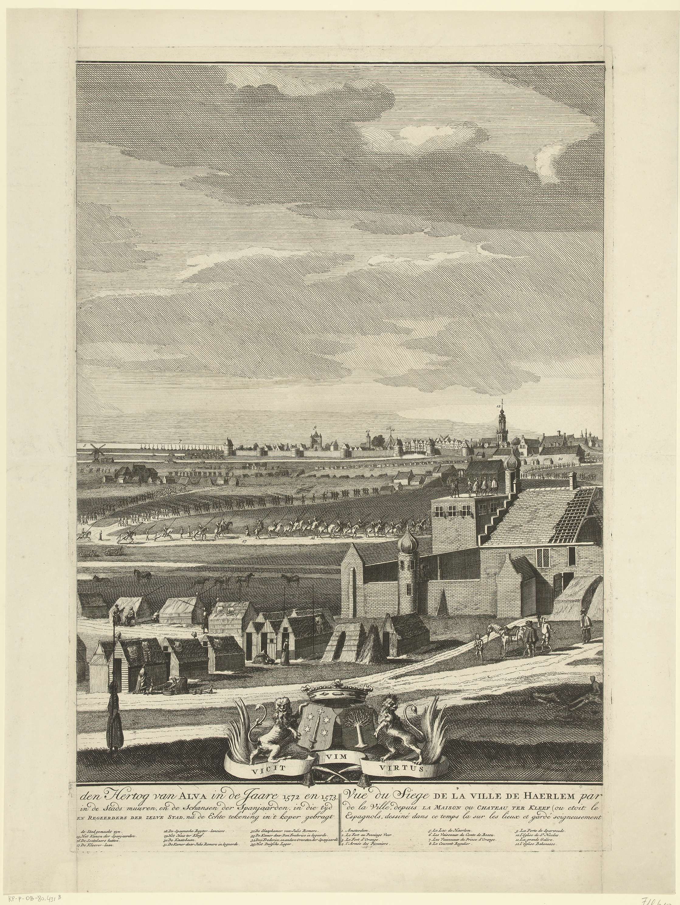 Belegering van de stad Haarlem in de jaren 1572-1573 door de Spanjaarden onder Fadrique Alvarez de Toledo (Don Frederik), de zoon van de hertog van Alva. Grote voorstelling met een gezicht op de stad vanuit het noorden, in prent naar een eigentijdse tekening in drie bladen, waarvan dit het middenblad is. Onder in het midden ...