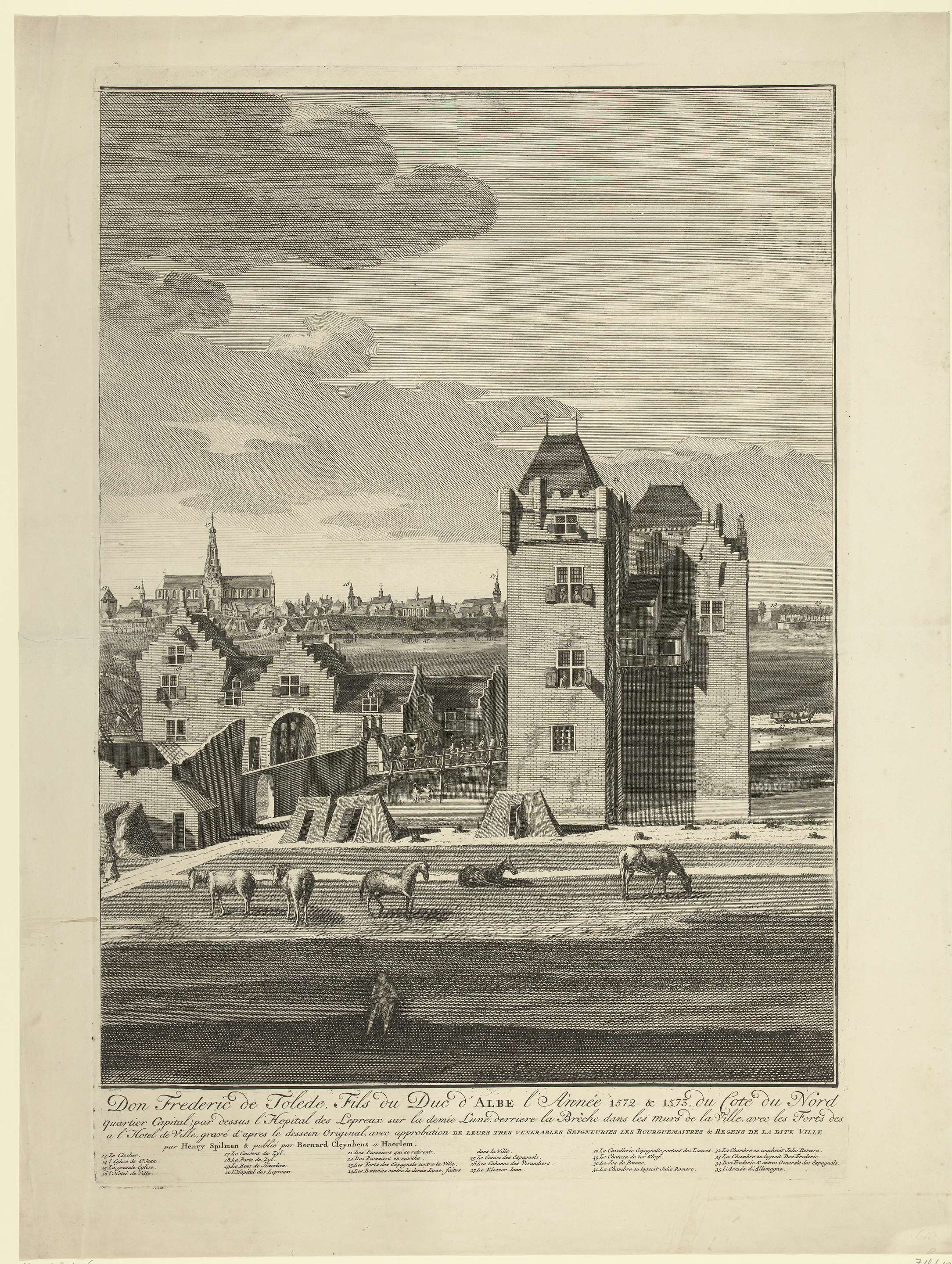 Belegering van de stad Haarlem in de jaren 1572-1573 door de Spanjaarden onder Fadrique Alvarez de Toledo (Don Frederik), de zoon van de hertog van Alva. Grote voorstelling met een gezicht op de stad vanuit het noorden, in prent naar een eigentijdse tekening in drie bladen, waarvan dit het rechterblad is. Rechts het Huis ter ...