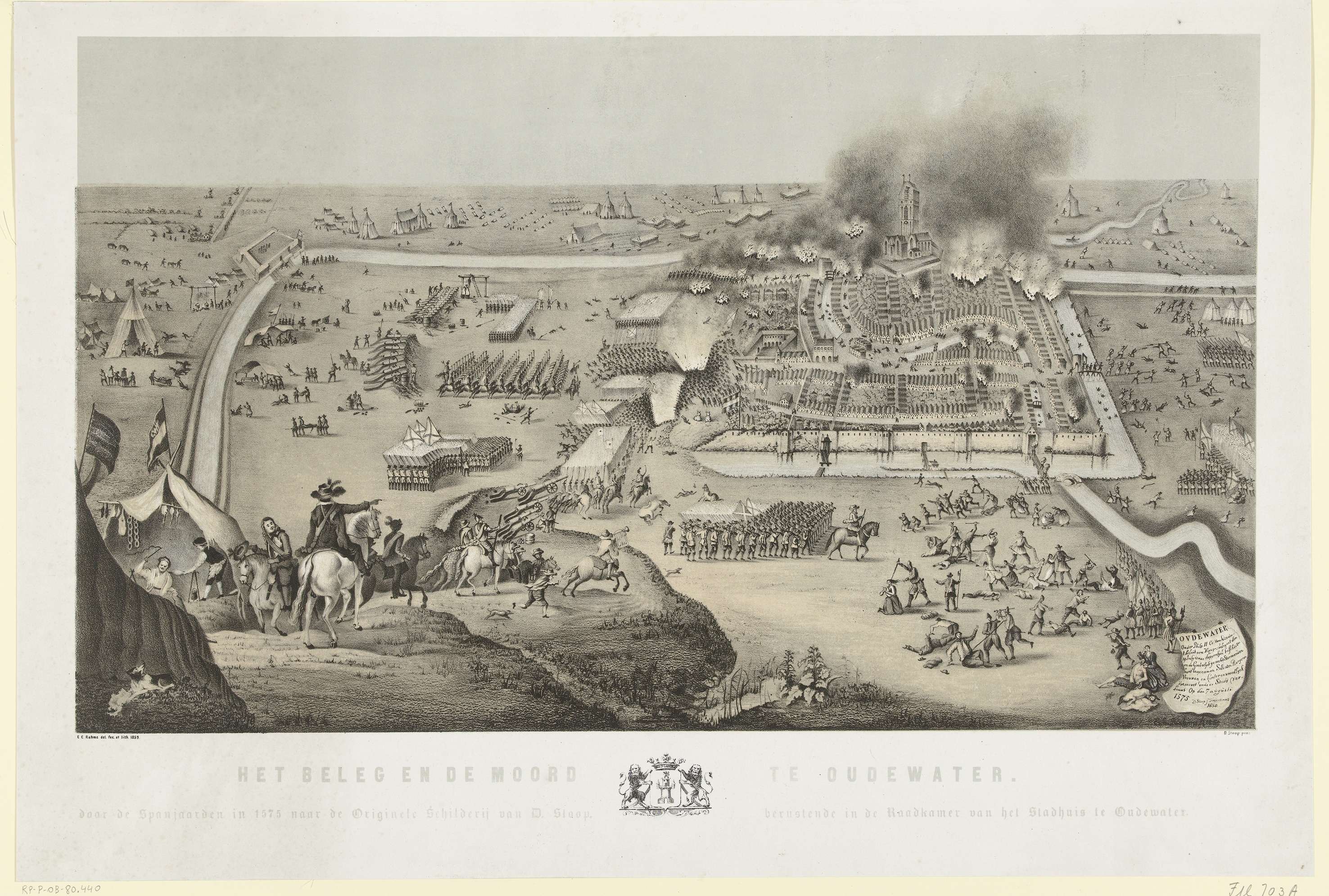 Beleg en moord door de Spanjaarden onder Hierges te Oudewater, 8 augustus 1575. Gezicht op brandende stad en omgeving met de posities van de Spanjaarden; burgers die de stad proberen te verlaten worden door de soldaten gedood. Met titel en stadswapen onder de voorstelling. Rechts in de voorstelling een banderol met onderwerp en naam maker. ...