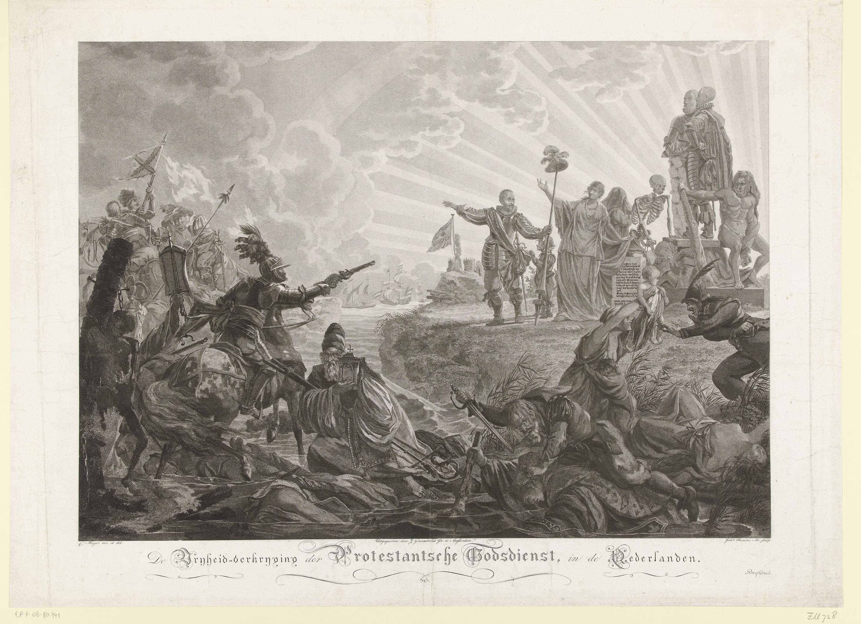 Allegorie op de verkregen vrijheid van de Protestantse godsdienst in de Nederlanden in 1577. Prins Willem I met lans en vrijheidshoed bij de personificatie van de Godsdienst voor een monument voor de strijd voor vrijheid van geloof met de graven van Egmond en Horne staande op de knielende Alva, in zonnestralen. Achter de prins de ...