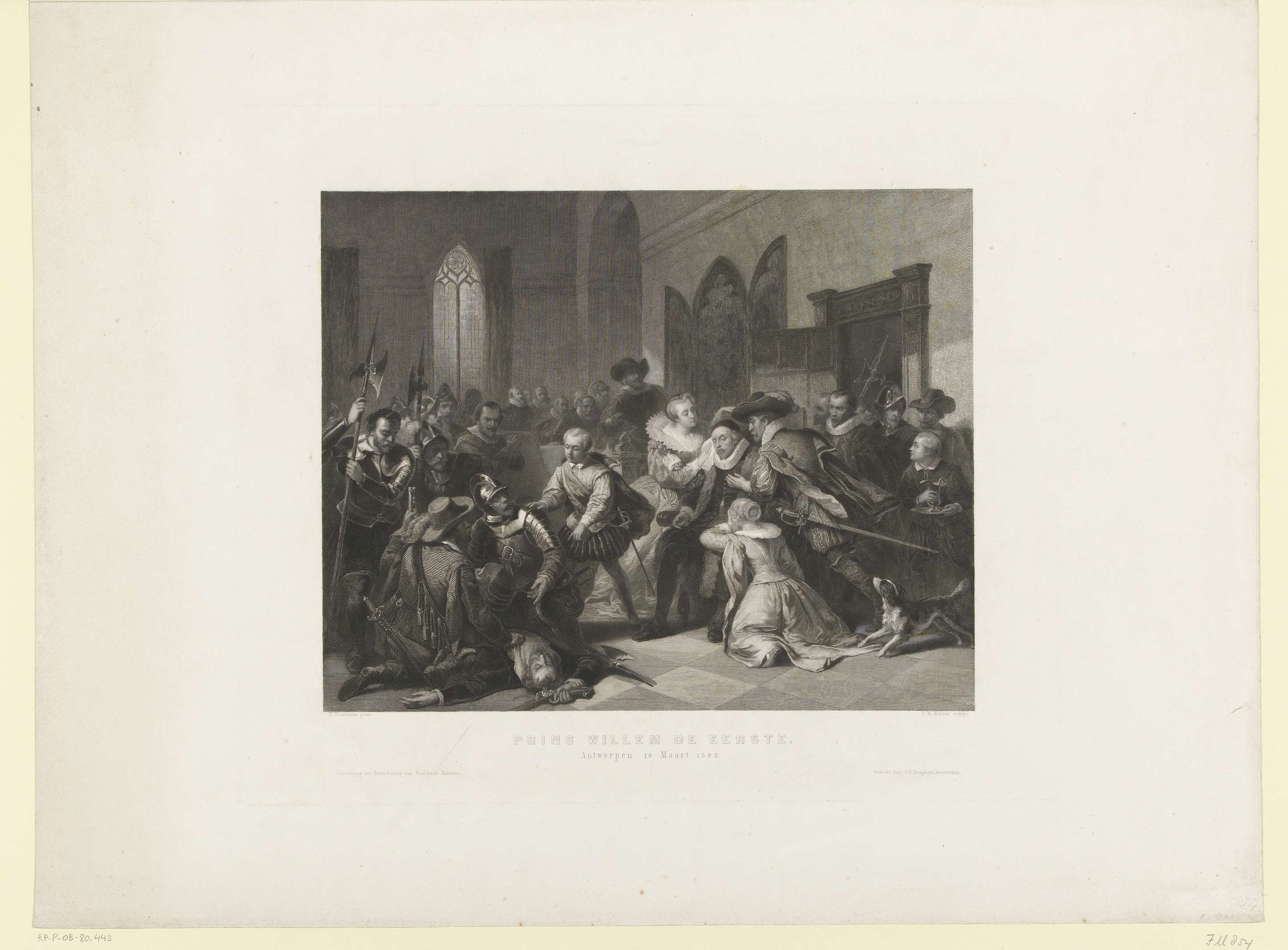 Aanslag van Jean de Jauregui op prins Willem I, 18 maart 1852 te Antwerpen. Interieur met de prins zittend gewond in een stoel, om hem heen familie en anderen. Links ligt het lichaam van de gedode Jean de Jauregui op de vloer, Maurits vraagt de soldaten hem te onderzoeken.