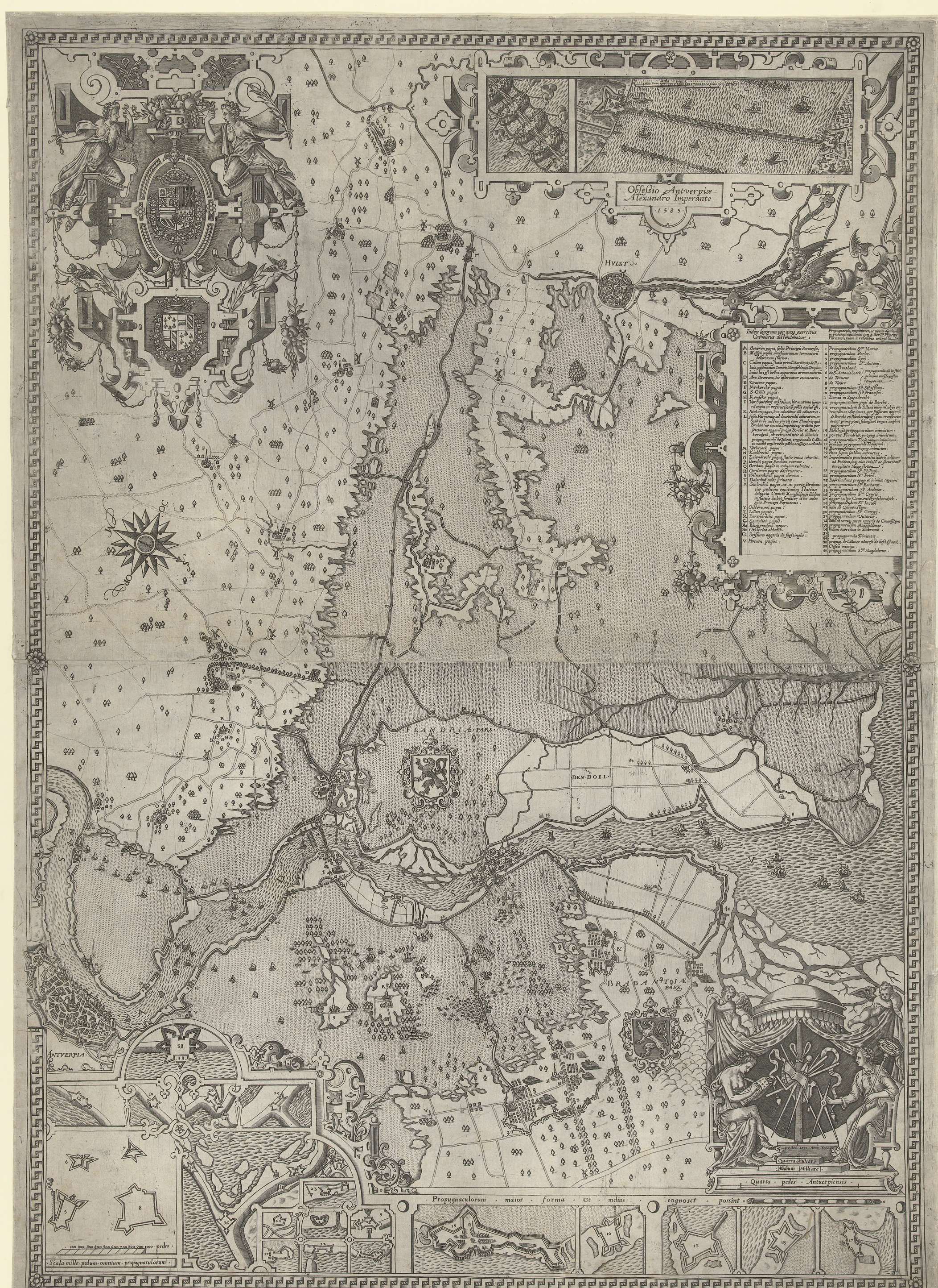 Kaart van het beleg van Antwerpen in de jaren 1584-1585 door het Spaanse leger onder Alessando Farnese, de hertog van Parma. Kaart van het verdronken land rond de Schelde tussen Antwerpen en Hulst. Linksboven een ornamentele cartouche met de Rechtvaardigheid en Vrede, versierd met rolwerk en met de wapens van Filips II en de hertog ...