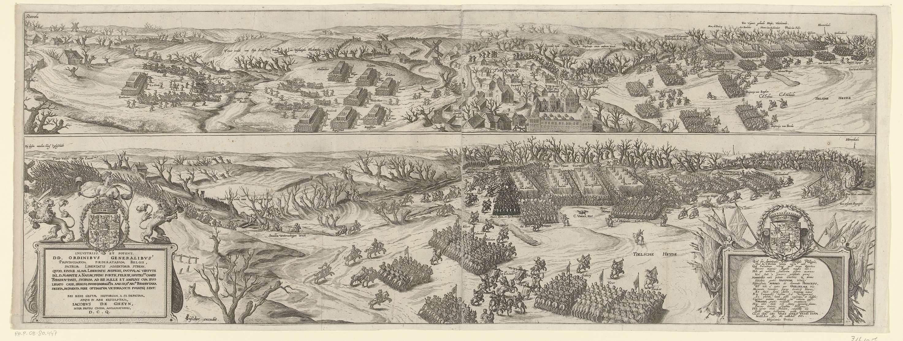 Slag bij Turnhout en belegering van het kasteel te Turnhout, 24 januari 1597. Voorstelling in twee stroken. Boven: het oprukkende leger onder Maurits in achtervolging op de Spaanse troepen van Ravels via Turnhout naar de Tielenheide. Onder: de veldslag op de Tielenheide en de vluchtende Spaanse cavalerie. Linksonder een cartouche met twee leeuwen en de ...