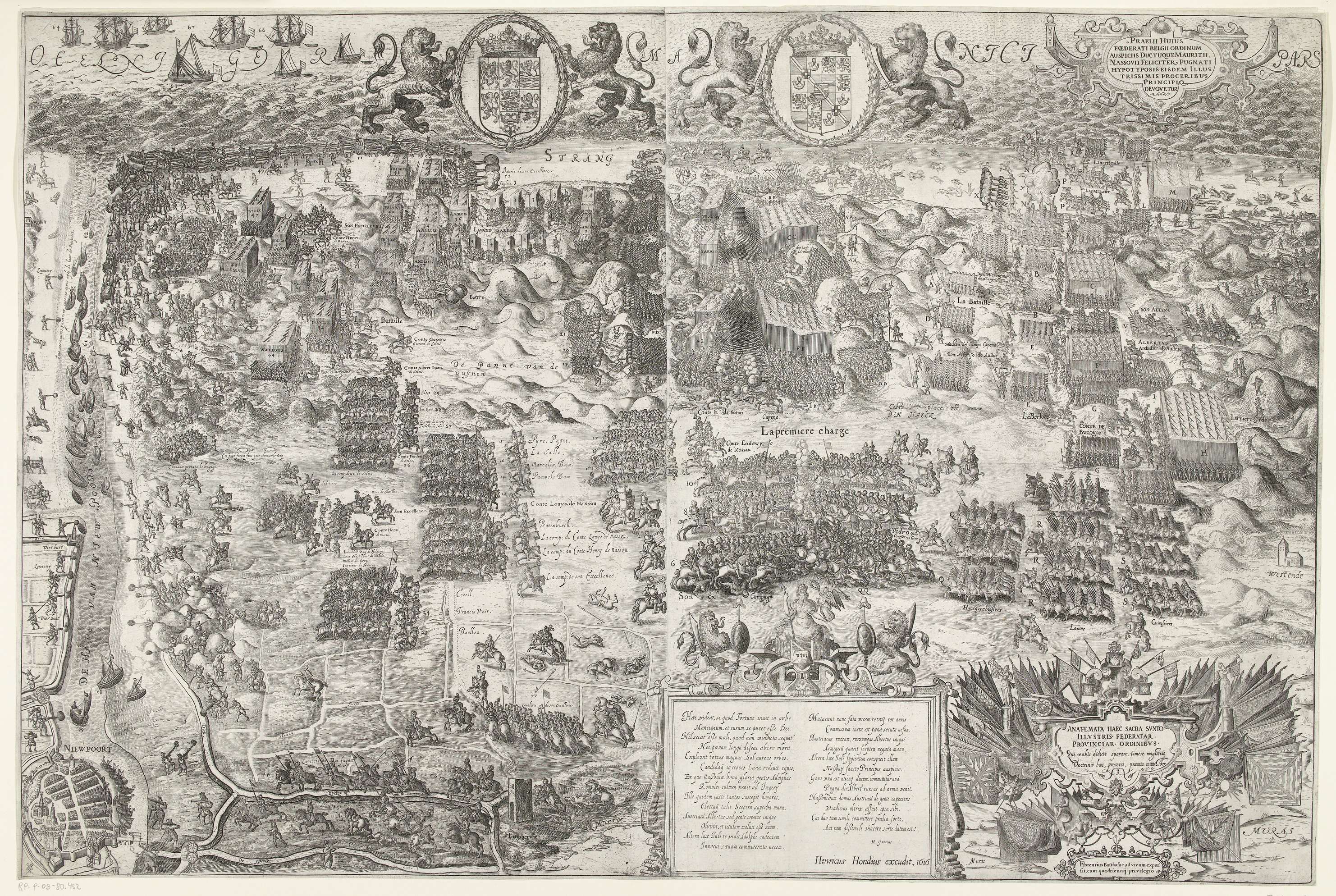 De slag bij Nieuwpoort, 2 juli 1600. Grote voorstelling op twee bladen van de veldslag, de gevechten op het strand en in de duinen tussen het Staatse leger onder Maurits en de Spaanse troepen onder Albrecht. Bovenaan leeuwen met de wapens van de Staten-Generaal en Maurits en de opdracht. Onderaan cartouches met een verzen van ...