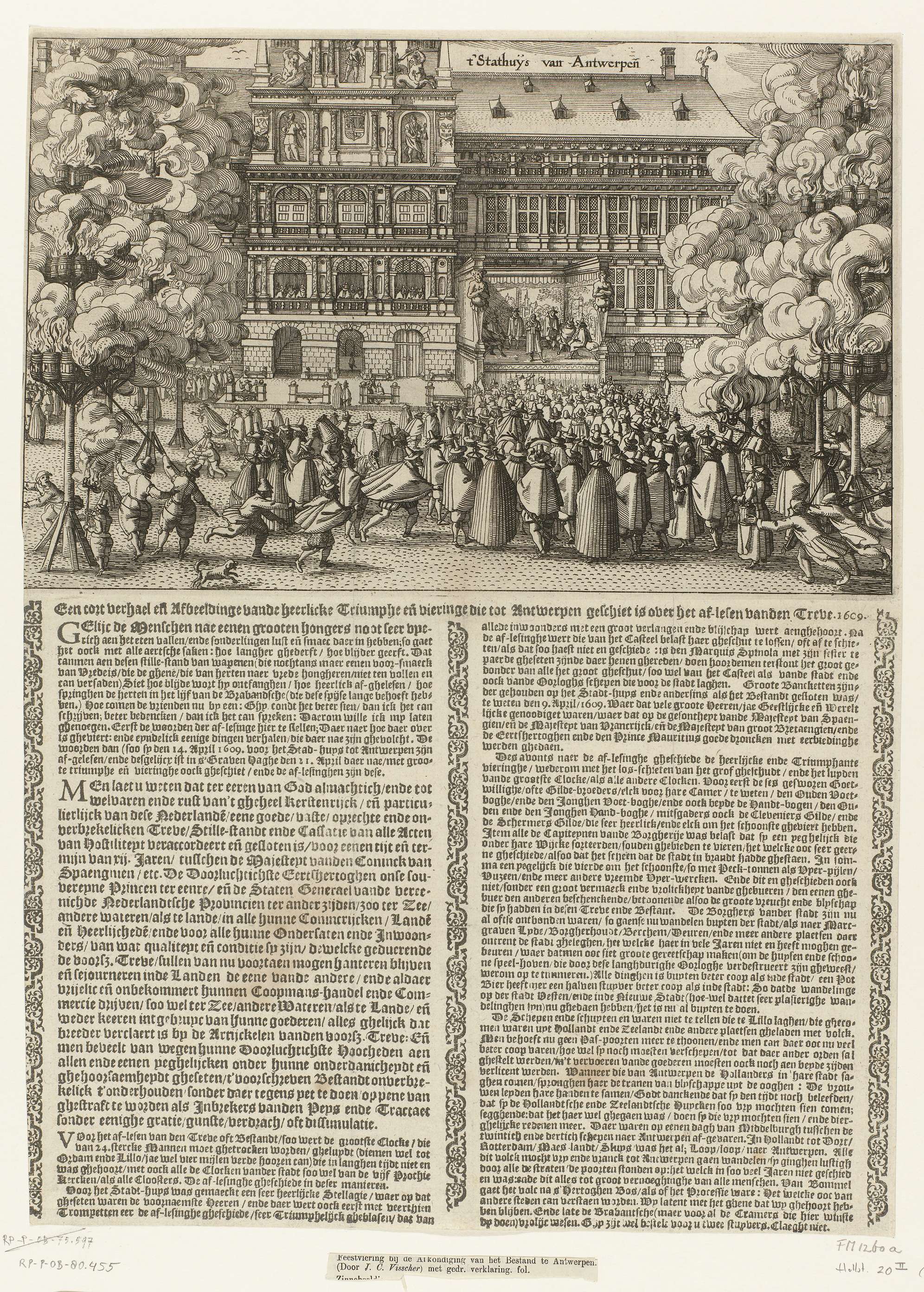 De afkondiging van het bestand. De vrede gesloten op 9 april in Den Haag wordt bekend gemaakt en voorgelezen aan het publiek op de Grote Markt vanaf een podium opgesteld tegen de gevel van het stadhuis van Antwerpen, 14 april 1609. Links en rechts stellages met brandende pektonnen. Onder de voorstelling een gedrukte tekst in ...
