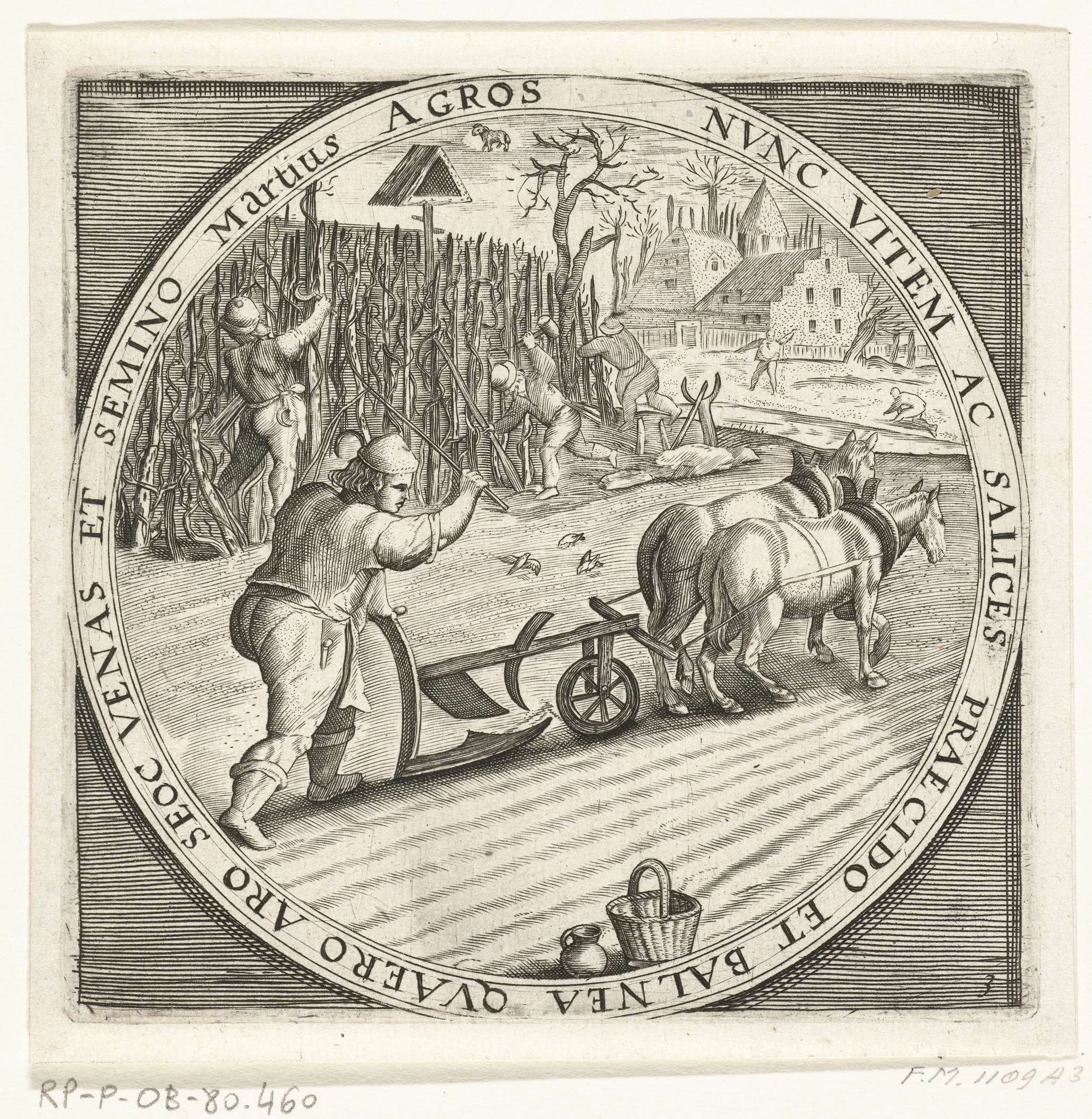 Ronde voorstelling met de maand maart. Een ploegende boer en werken aan de wijnranken, ca. 1600. Met het teken van de Ram. Met randschrift in het Latijn. Prent nr. 3 in de serie van de twaalf maanden van het jaar verbeeld in scènes uit het volksleven.
