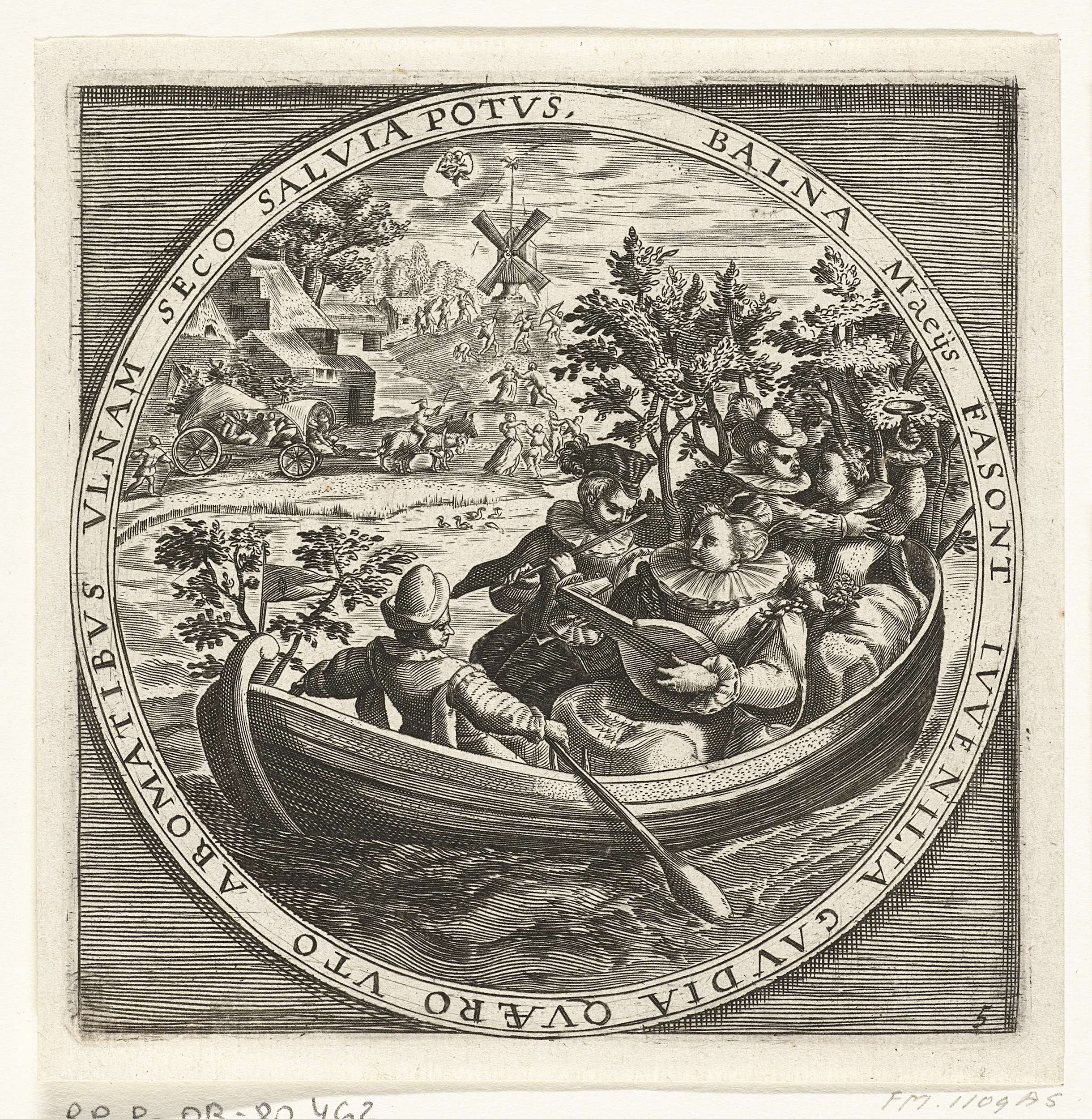Ronde voorstelling met de maand mei. Een elegant gezelschap van twee paren maken muziek en vermaken zich in een roeibootje, ca. 1600. Met het teken van de Tweelingen. Met randschrift in het Latijn. Prent nr. 5 in de serie van de twaalf maanden van het jaar verbeeld in scènes uit het volksleven.