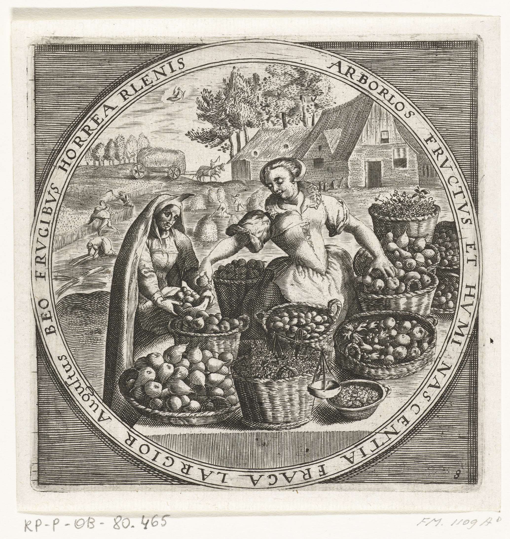 Ronde voorstelling met de maand augustus. Een boerenvrouw verkoopt fruit aan een vrouw uit de stad, ca. 1600. Met het teken van de Maagd. Met randschrift in het Latijn. Prent nr. 8 in de serie van de twaalf maanden van het jaar verbeeld in scènes uit het volksleven.