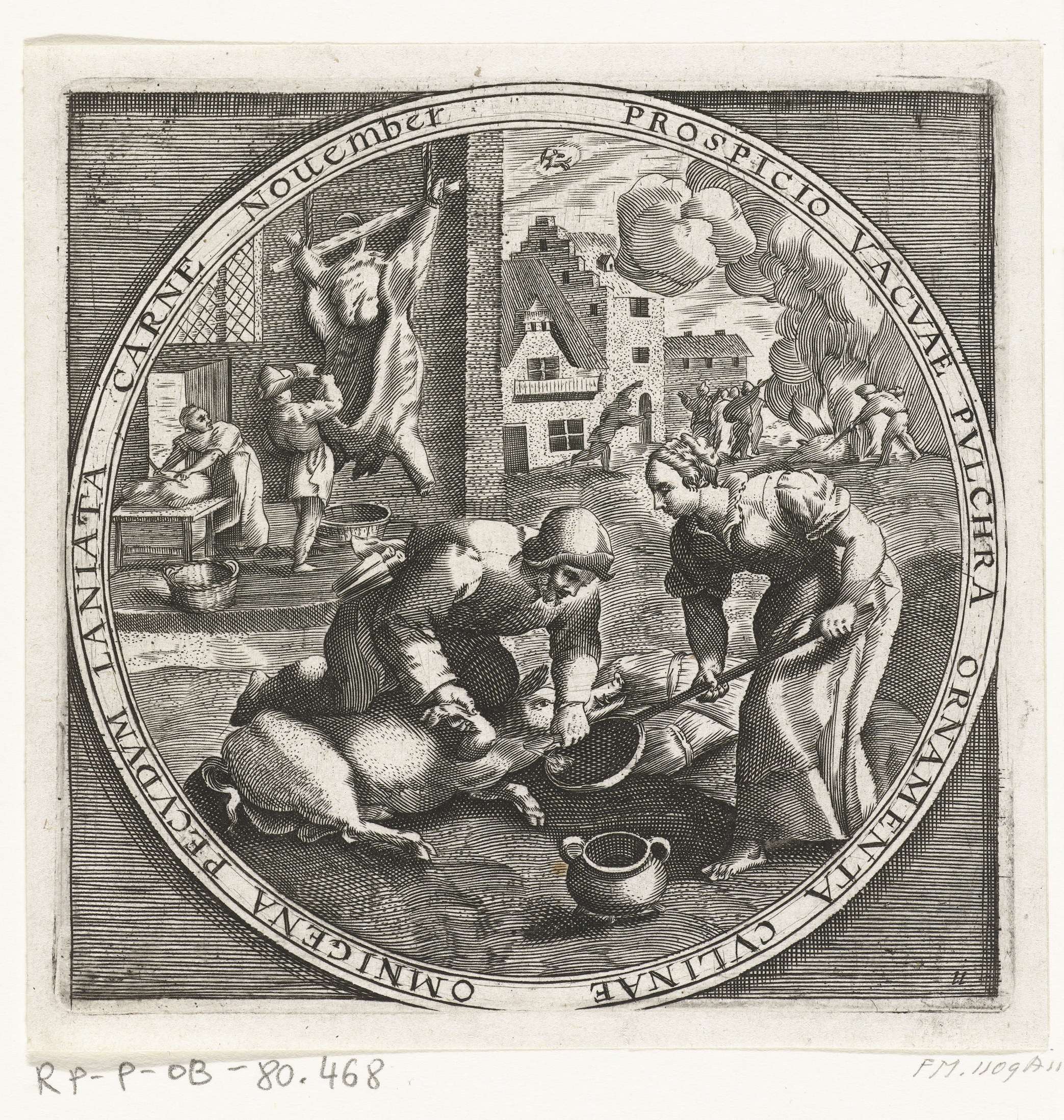 Ronde voorstelling met de maand november. Het slachten van een varken, ca. 1600. Met het teken van de Boogschutter. Met randschrift in het Latijn. Prent nr. 11 in de serie van de twaalf maanden van het jaar verbeeld in scènes uit het volksleven.