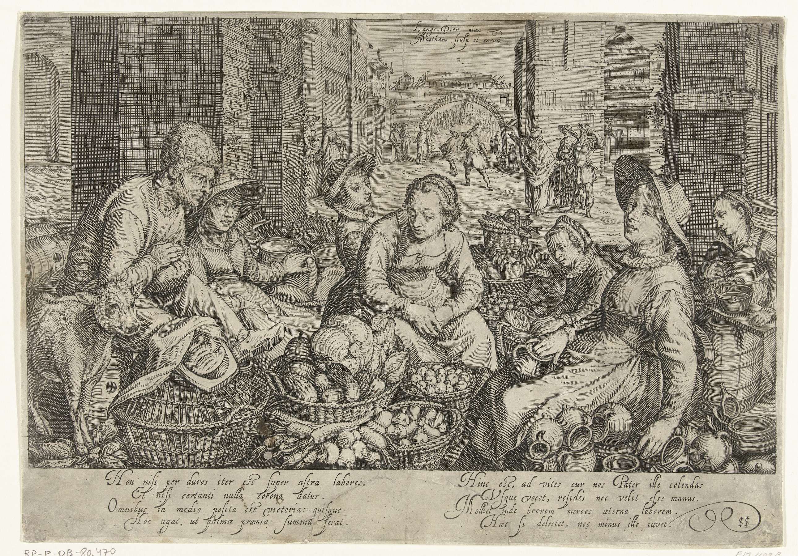 Marktscène met marktvrouwen en verkopers van groenten, kaas, gevogelte, brood, boter en aardewerk, links een kalfje. Scène in een stad. Op de achtergrond de parabel van de arbeiders in de wijngaard. Met onderschrift van 2 verzen van elk 4 regels in het Latijn.