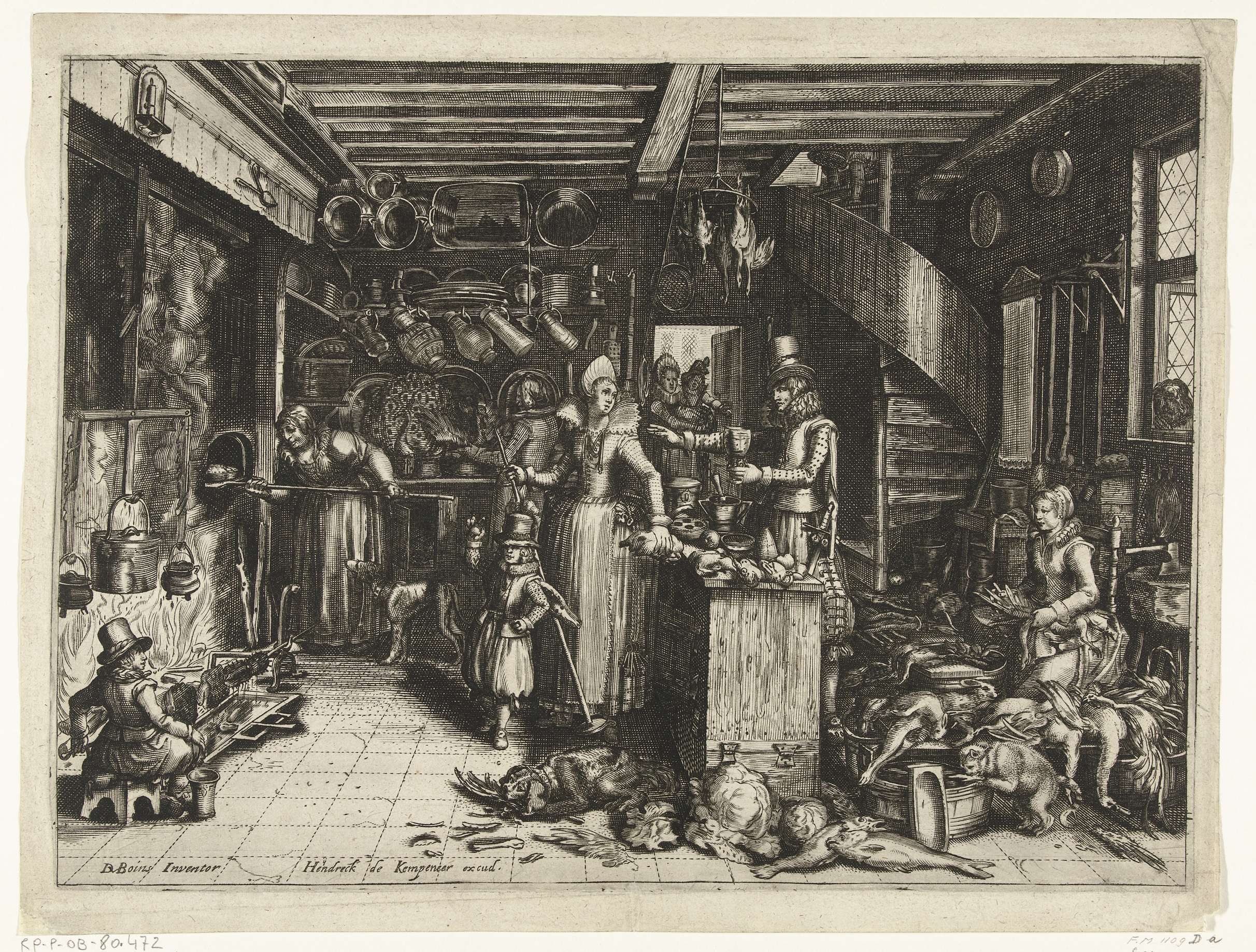 Interieur van een volle rijke keuken met de leden van een welgestelde familie. Met veel keukengereedschap en etenswaren: gevogelte, groente, vissen etc. Links het roosteren van gevogelte bij het vuur, een oude vrouw bakt brood. Rechts plukt een keukenmeid een vogel. In het midden een elegant paar.