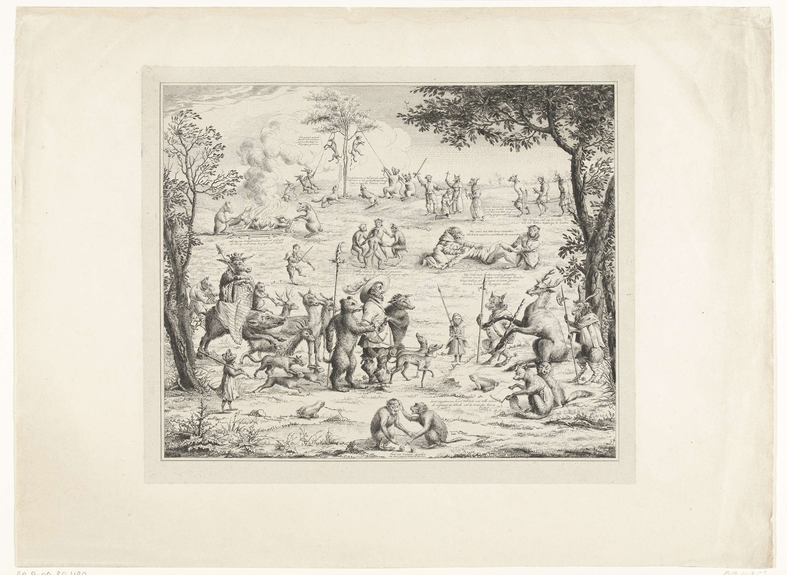 Spotprent van de verkeerde wereld waarin de jager gevangengenomen en berecht wordt door dieren. Op de achtergrond worden mensen door dieren beroofd, onthoofd en levend gebraden aan het spit terwijl de dieren feest vieren. In de voorstelling versjes in het Nederlands. Kopie naar een 17e-eeuws voorbeeld.