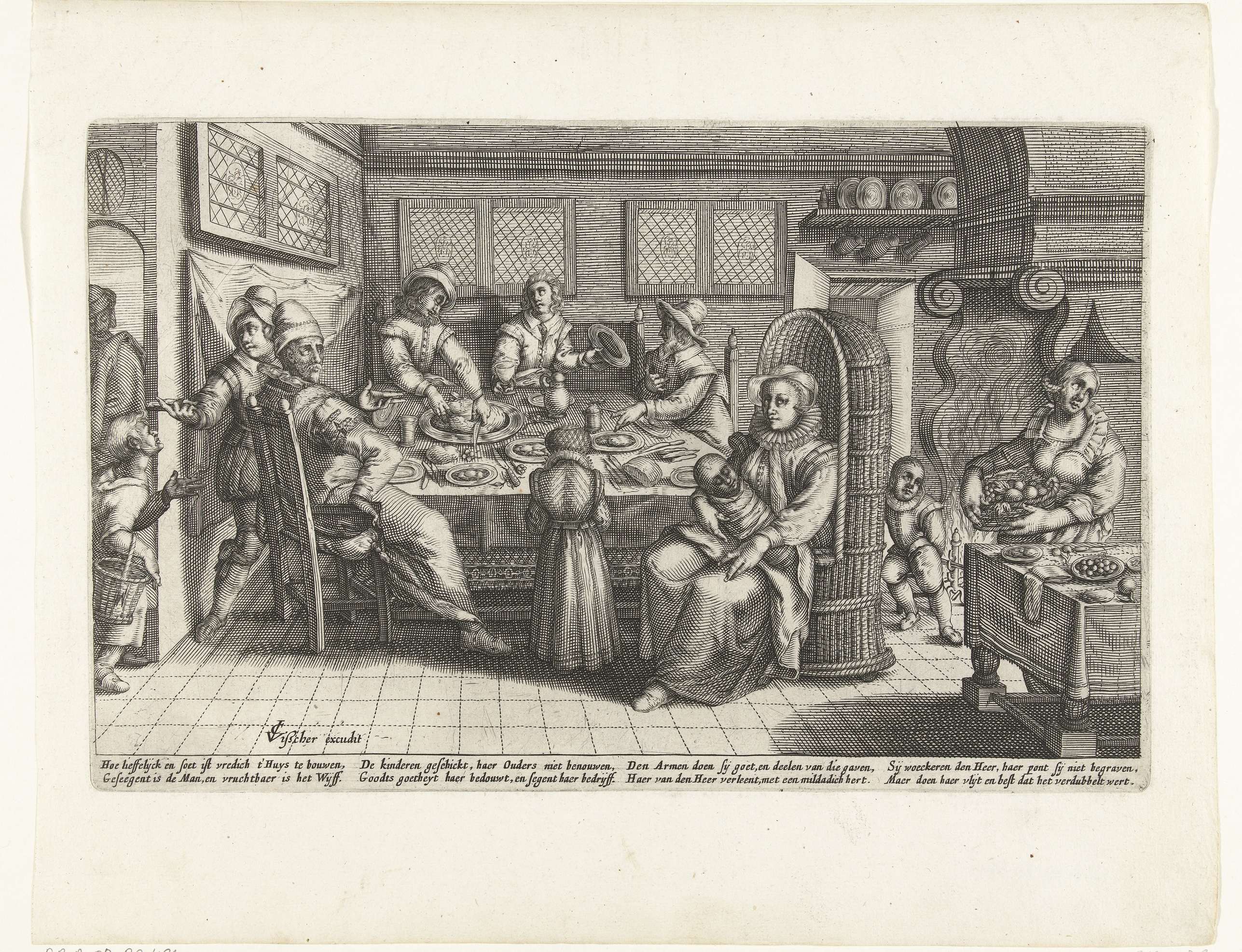 Het goede huishouden, ca. 1600. Interieur met een welgesteld, rechtvaardig en christelijk gezin gezeten aan de maaltijd. Links wordt een aalmoes aan een bedelaar gegeven, rechts de keukenmeid in de keuken. Met onderschrift van 4 keer 2 regels in het Nederlands.