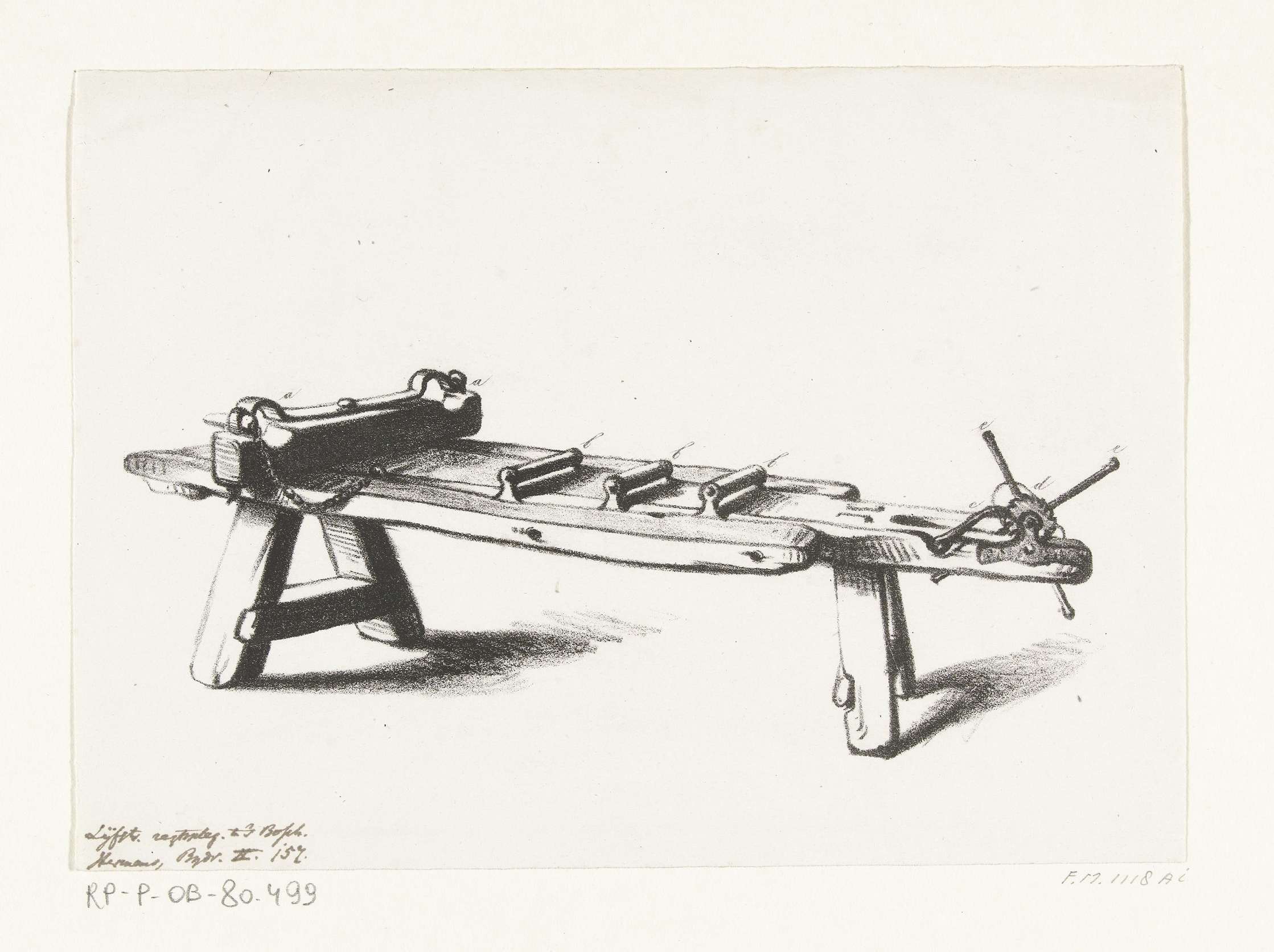 Folterwerktuigen. Een pijnbank. Martelwerktuigen in gebruik in 's-Hertogenbosch, ca. 1600. Onderaan een opschrift met pen.