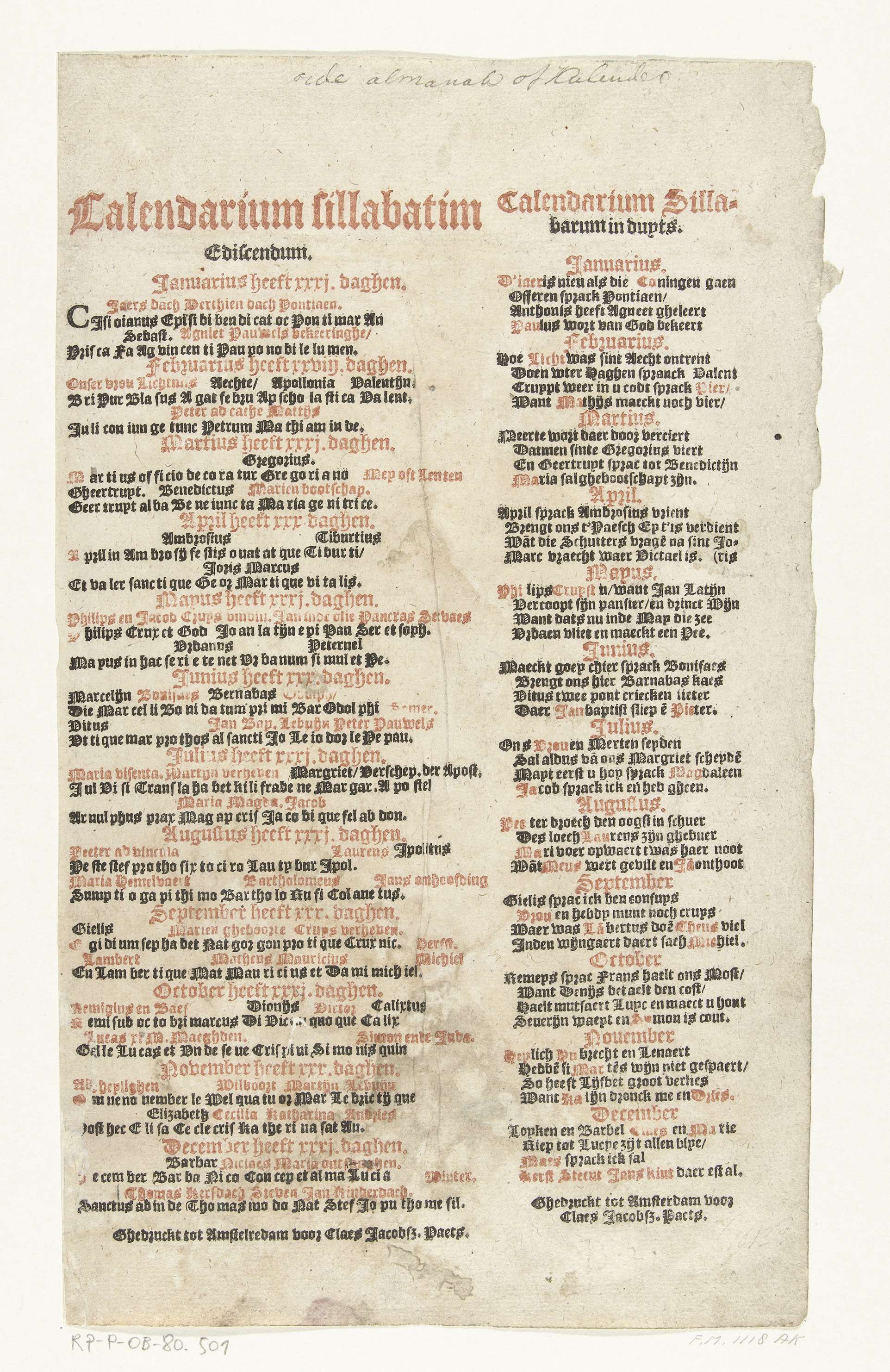 Uitleg bij een oud kalender, ca. 1600. Bij elke maand een versje met namen van heiligen.