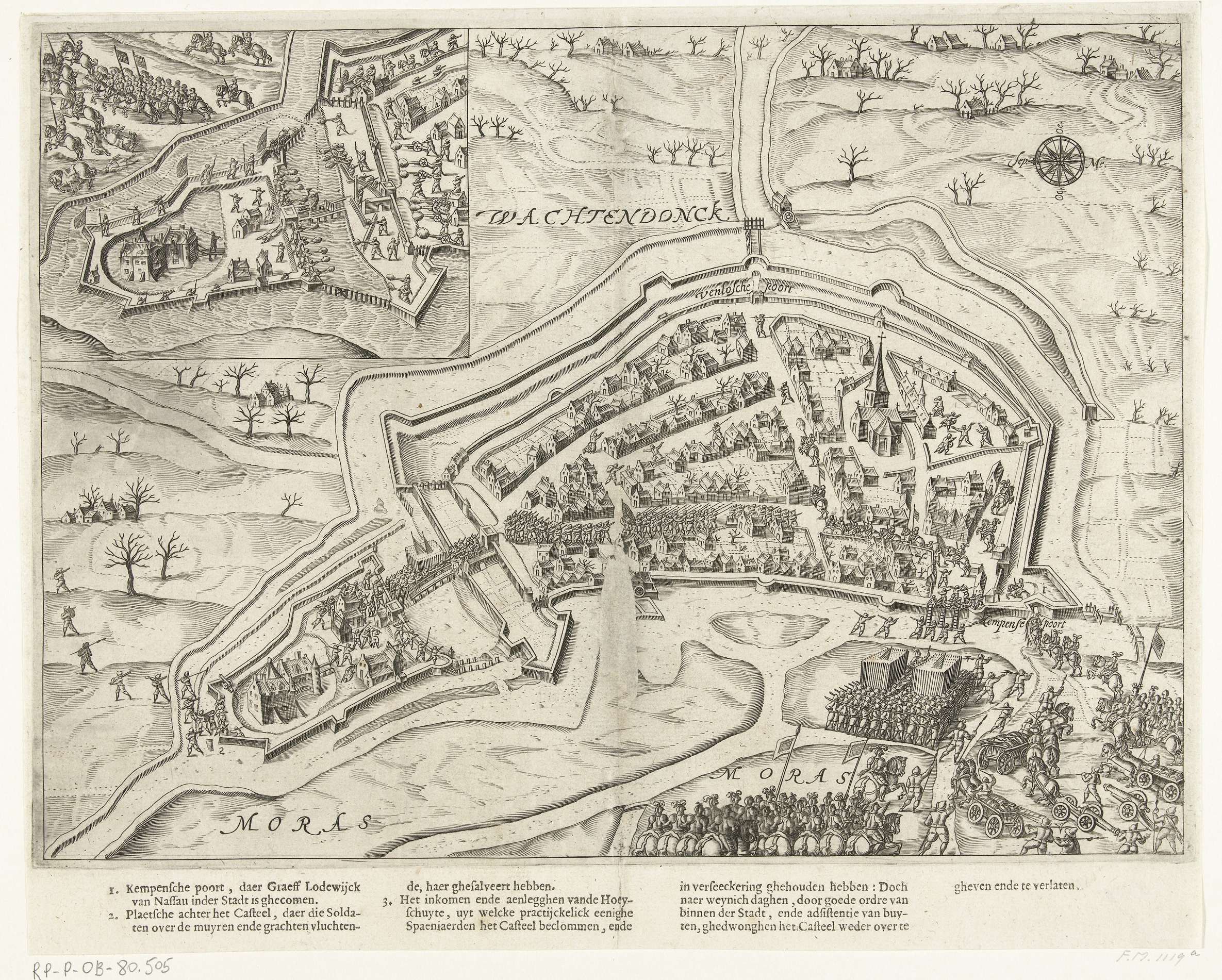Verovering van Wachtendonk door Lodewijk Gunther, graaf van Nassau, 23 januari 1600. Plan van de stad en nabije omgeving. Onderaan trekken de Staatse troepen bij de Kempense poort de stad binnen. Linksboven een inzet met de strijd rond het kasteel Wachtendonk. Apart gedrukt onder de plaat de legenda 1-3 in het Nederlands.