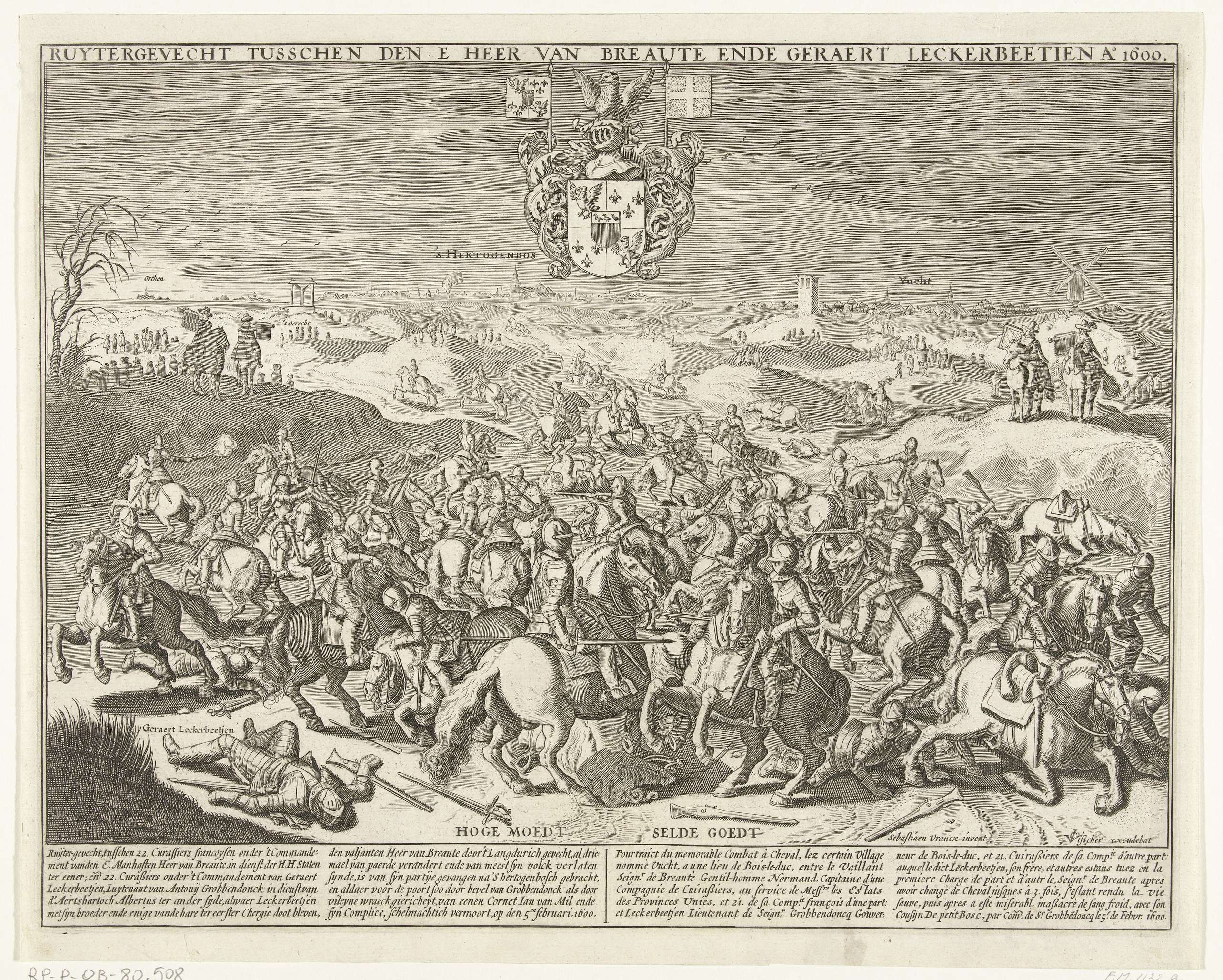 Het gevecht van Lekkerbeetje. Ruitergevecht op de Vughterheide bij Den Bosch tussen de Spaanse ruiters onder Anthony Schetz van Grobbendonck en de Staatse ruiters onder de Pierre de Breauté, 5 februari 1600. Op de voorgrond links ligt de gesneuvelde Gerardt Abrahamsz. Lekkerbeetje. In de verte 's-Hertogenbosch en Vught. Bovenin het wapen van Grobbendonck. Onderaan het ...