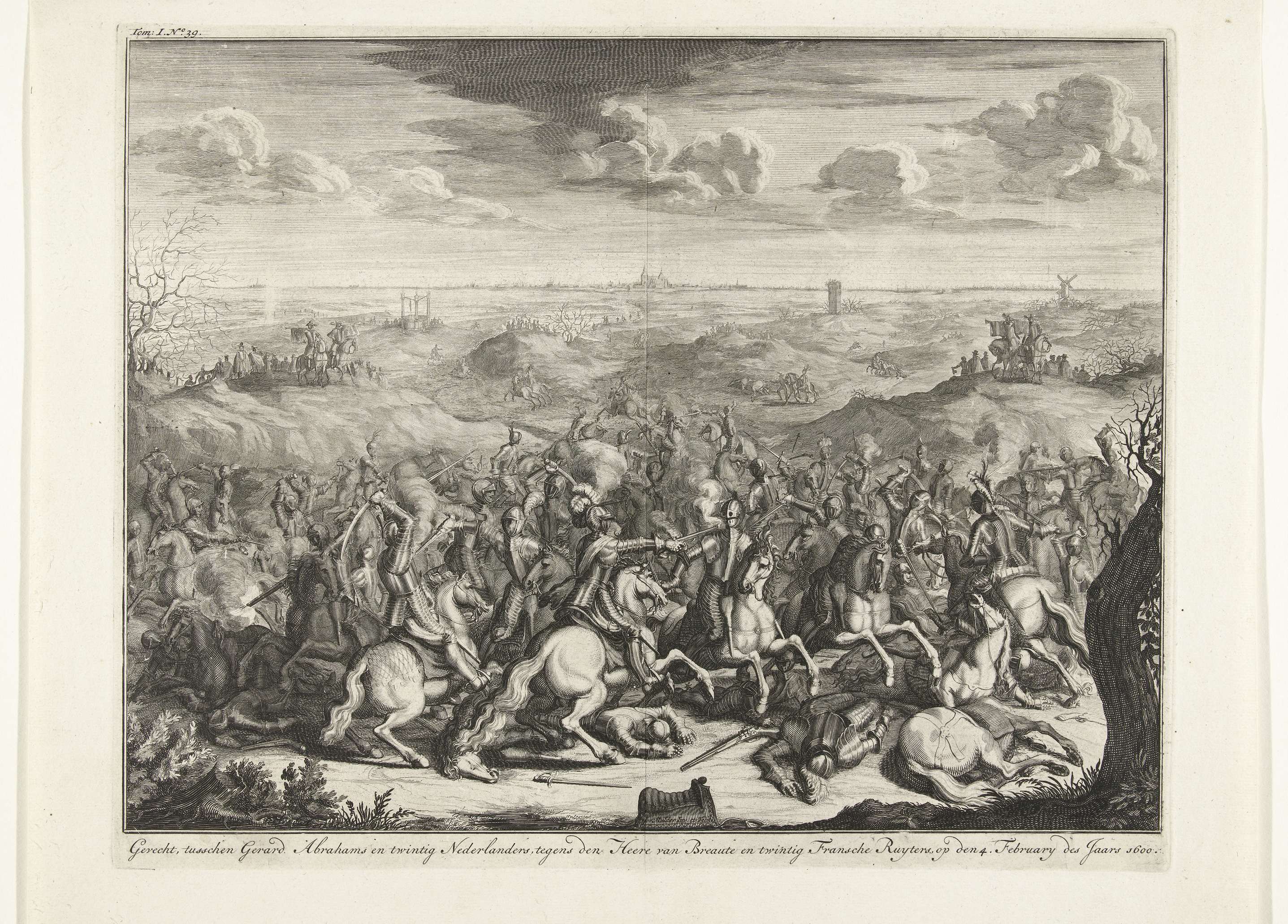 Het gevecht van Lekkerbeetje. Ruitergevecht op de Vughterheide bij Den Bosch tussen de Spaanse ruiters onder Anthony Schetz van Grobbendonck en de Staatse ruiters onder de Pierre de Breauté, 5 februari 1600. In de verte 's-Hertogenbosch.