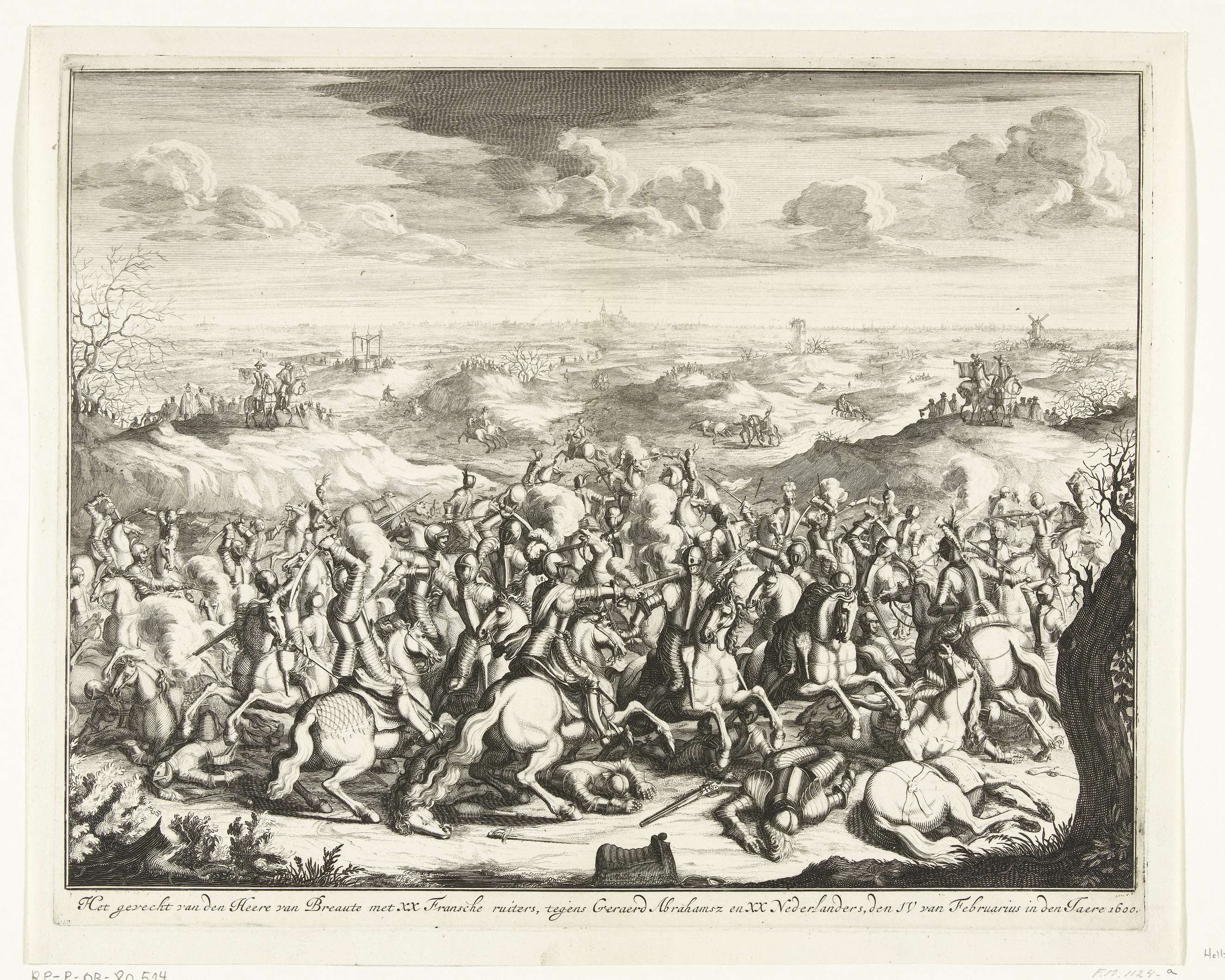 Het gevecht van Lekkerbeetje. Ruitergevecht op de Vughterheide bij Den Bosch tussen de Spaanse ruiters onder Anthony Schetz van Grobbendonck en de Staatse ruiters onder de Pierre de Breauté, 5 februari 1600. In de verte 's-Hertogenbosch.