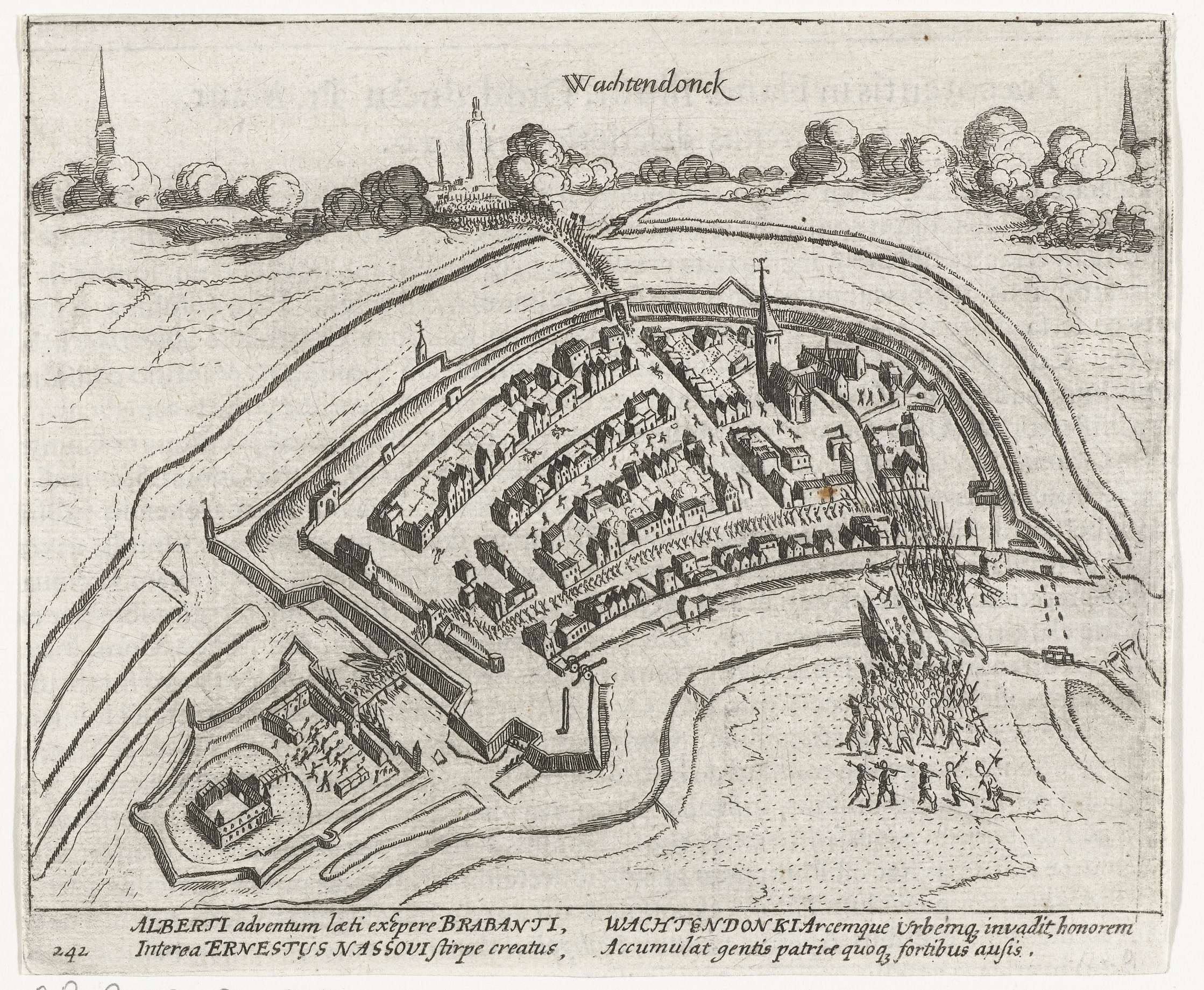 Verovering van Wachtendonk door Lodewijk Gunther, graaf van Nassau, 23 januari 1600. Plan van de stad, boven het landschap in profiel. Onderaan trekken de Staatse troepen bij de Kempense poort de stad binnen. Met onderschrift van 4 regels in het Latijn. Genummerd 242. Bedrukt op achterzijde met tekst in het Latijn.