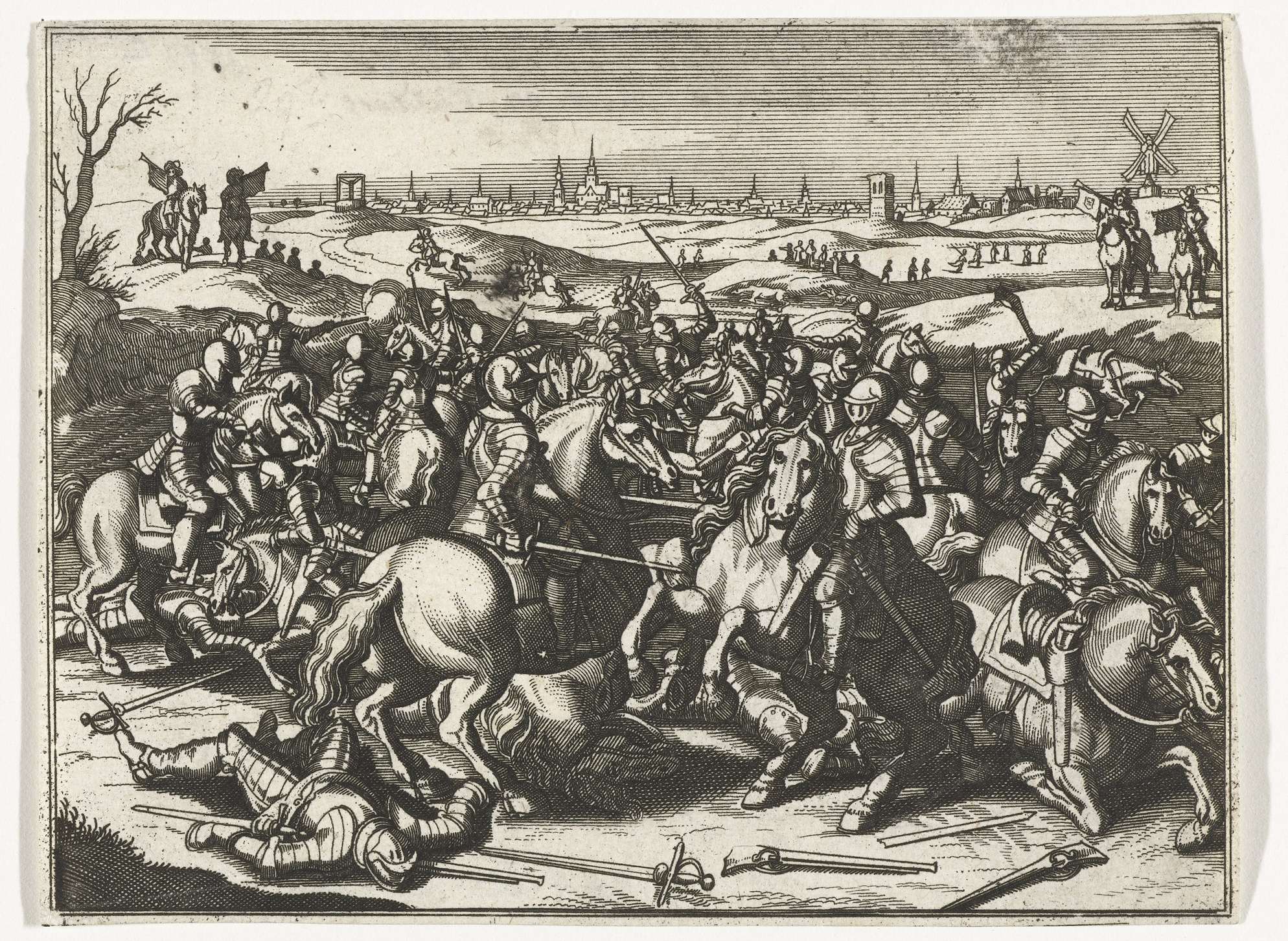 Het gevecht van Lekkerbeetje. Ruitergevecht op de Vughterheide bij Den Bosch tussen de Spaanse ruiters onder Anthony Schetz van Grobbendonck en de Staatse ruiters onder de Pierre de Breauté, 5 februari 1600. Op de voorgrond links ligt de gesneuvelde Gerardt Abrahamsz. Lekkerbeetje. In de verte 's-Hertogenbosch en Vught.