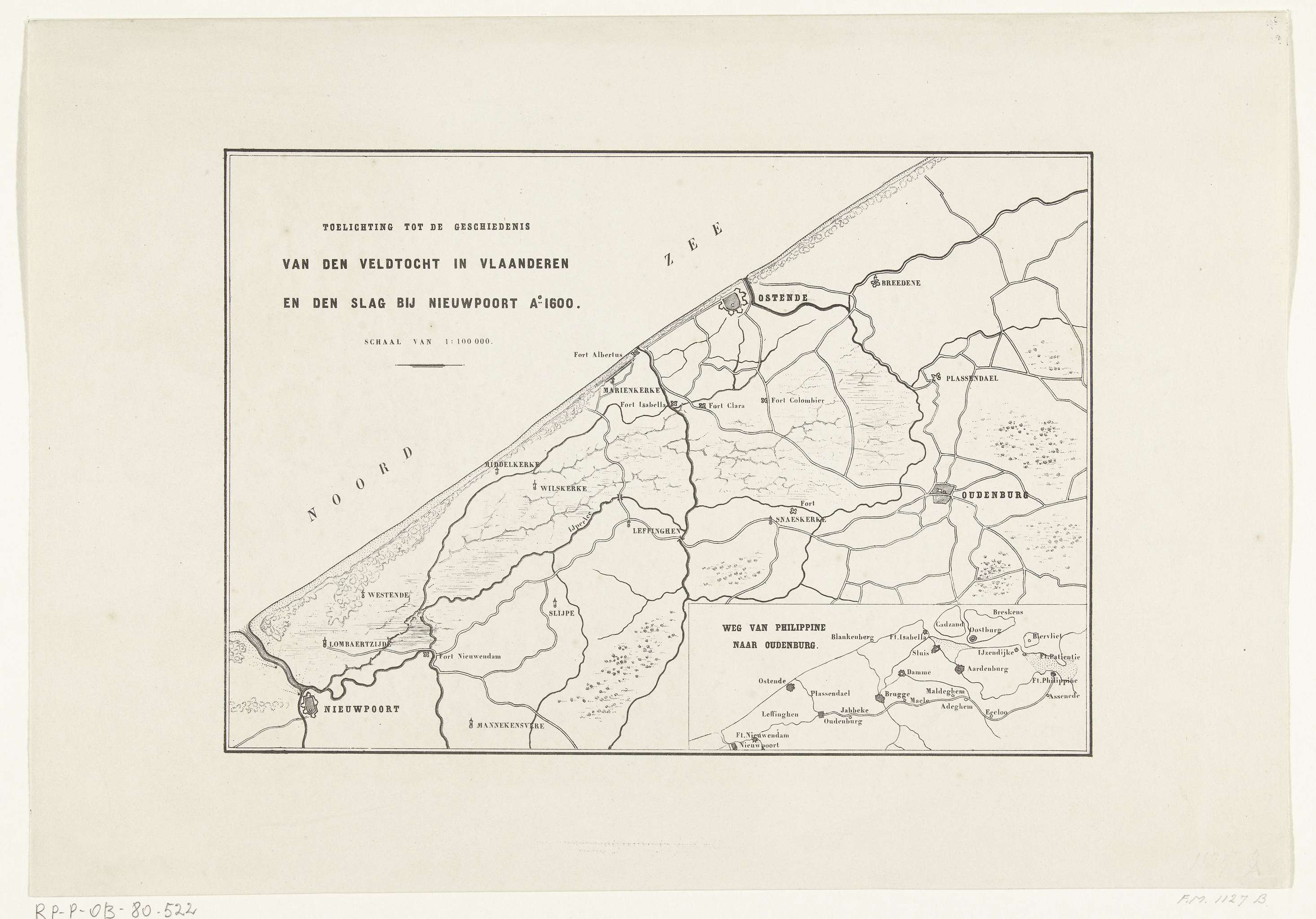 Kaart van de westkust van Vlaanderen tussen Oostende en Nieuwpoort, ter illustratie van de tocht naar Oostende van het Staatse leger onder Maurits, 19-27 juni, 1600. Met inzet met kaartje van de weg van Philippine naar Oudenburg.