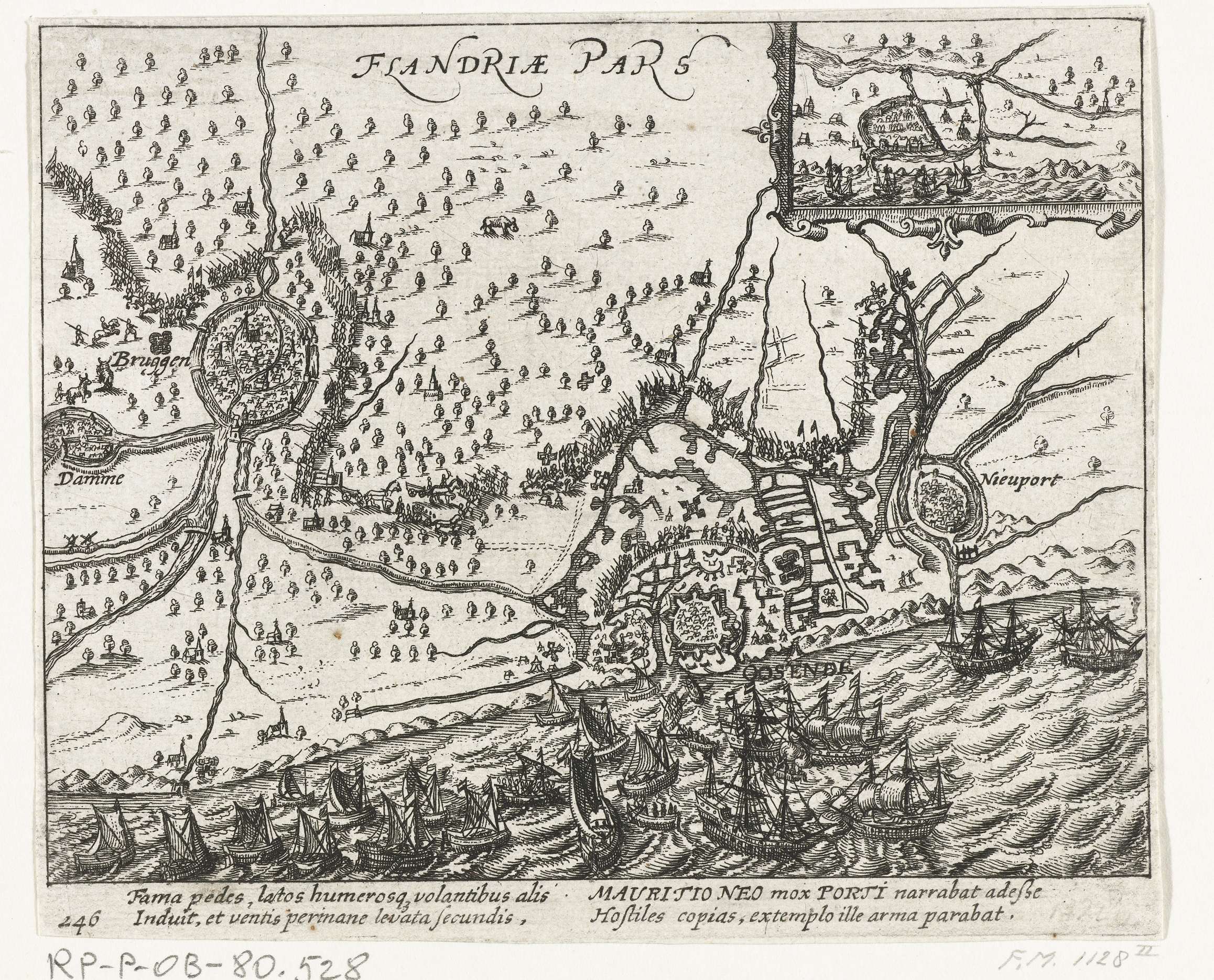 De Staatse vloot van Maurits komt aan bij Oostende (rechterblad), 1600. De kust van Vlaanderen, onderaan de kust met de stad Oostende. Rechterhelft van een voorstelling gedrukt op 2 bladen. Met onderschrift van 4 regels in het Latijn. Genummerd 246. Bedrukt op achterzijde met tekst in het Latijn.