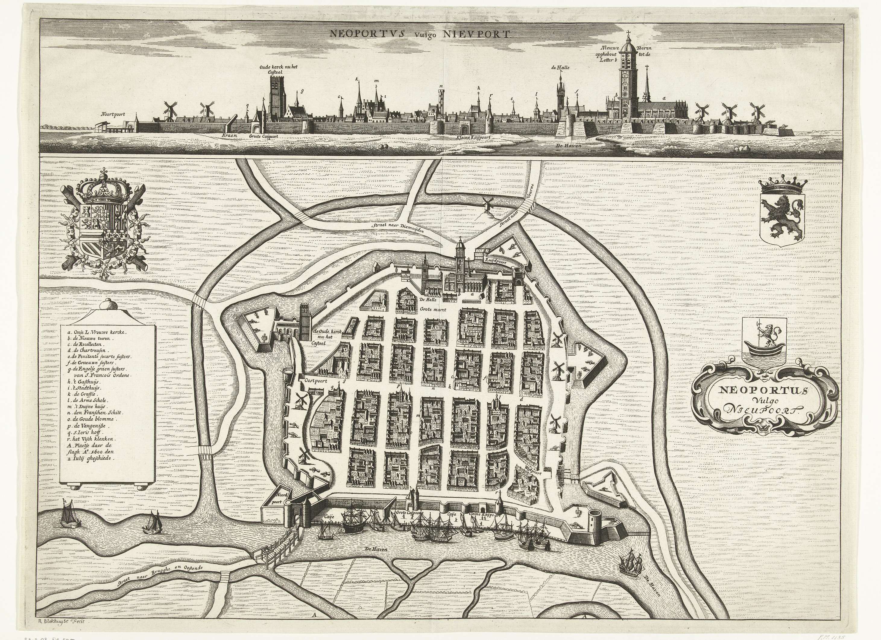 Plattegrond van de stad Nieuwpoort, afkomstig uit Flandria Illustrata (Amsterdam, 1641-44) van Antonius Sanderus. Bovenaan de stad in profiel. Links het wapen van de Spaanse koning en de legenda a-r in het Nederlands. Rechts cartouche met titel, stadswapen, wapen van Vlaanderen.