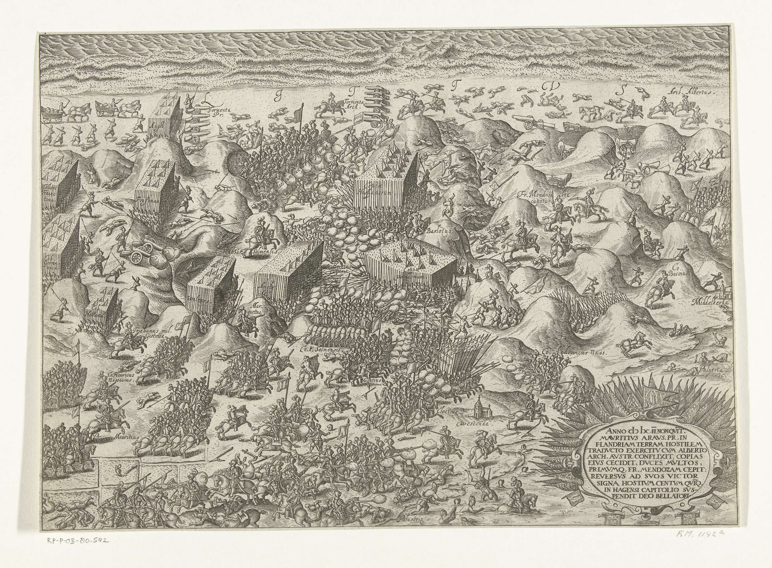 Slag bij Nieuwpoort. De Staatse en Spaanse legers in gevecht met elkaar op het strand bij Nieuwpoort, 2 juli 1600. Rechtsonderaan een cartouche met opschrift in het Latijn, versierd met buitgemaakte Spaanse vaandels.